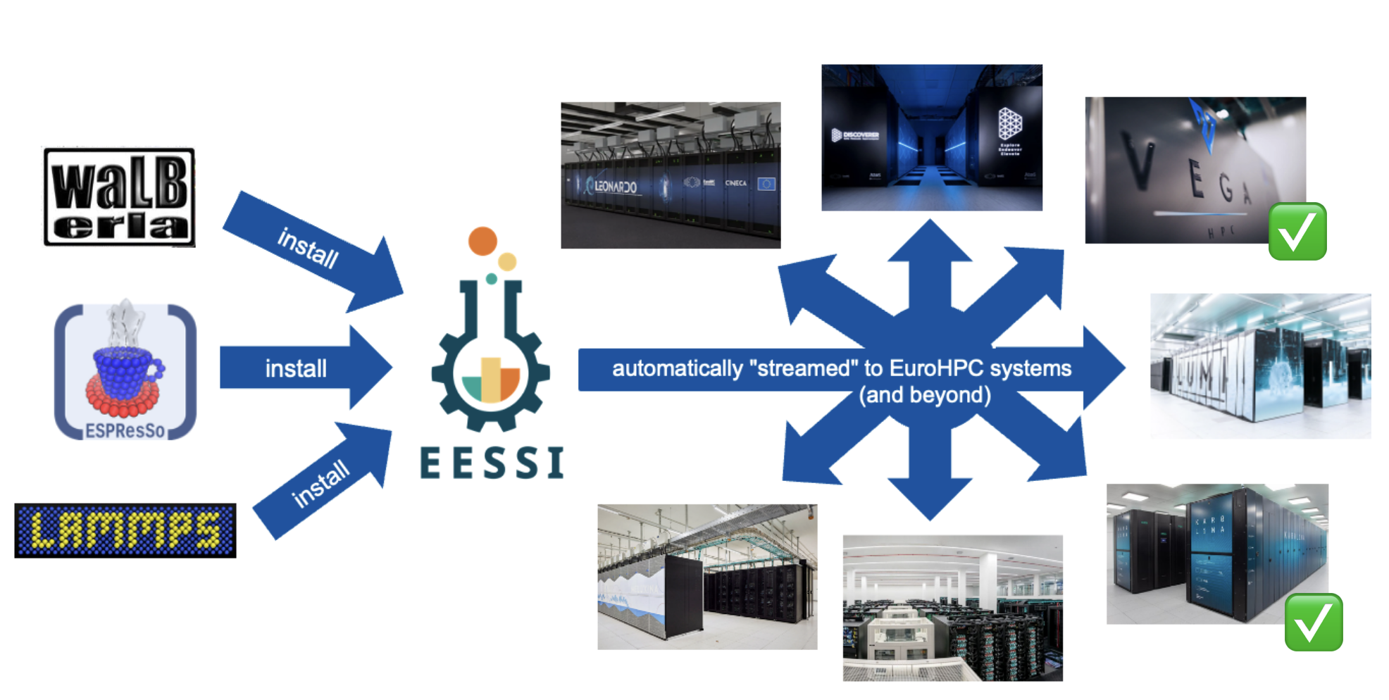 MultiXscale EESSI aims to create a standardized and consistent scientific software environment. It collaborates closely with EuroHPC to extend this uniform environment beyond just EuroHPC resources. The goal is to make it accessible across different levels of the infrastructure, even reaching beyond EuroHPC to platforms like the European Open Science Cloud.