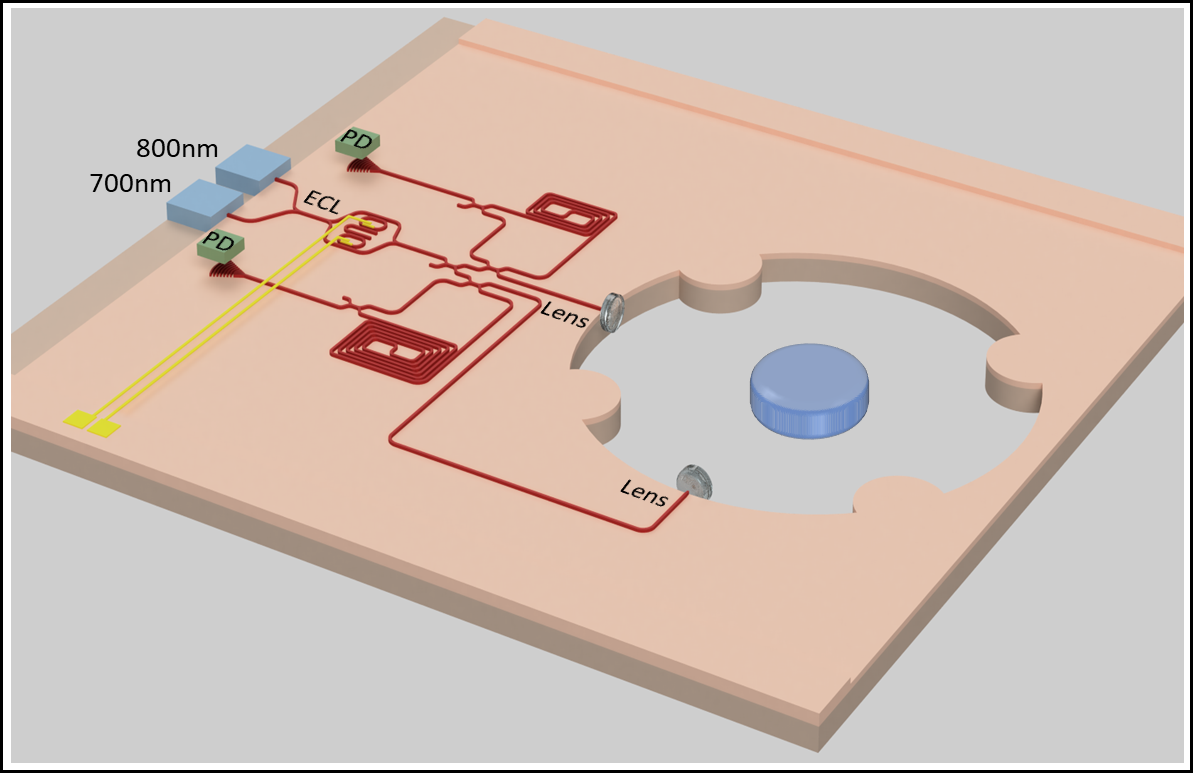 WP3: The design for the FCM and OCT PIC has been completed, the swept-source laser has been replaced with spectral domain OCT, the 3D printing process for lens fabrication has been successfully implemented at PHIX, the alignment markers for lens printing has been verified and lenses have been 3D printed on the side facets of test TriPleX PICs, and the first generation of control electronics is under development.