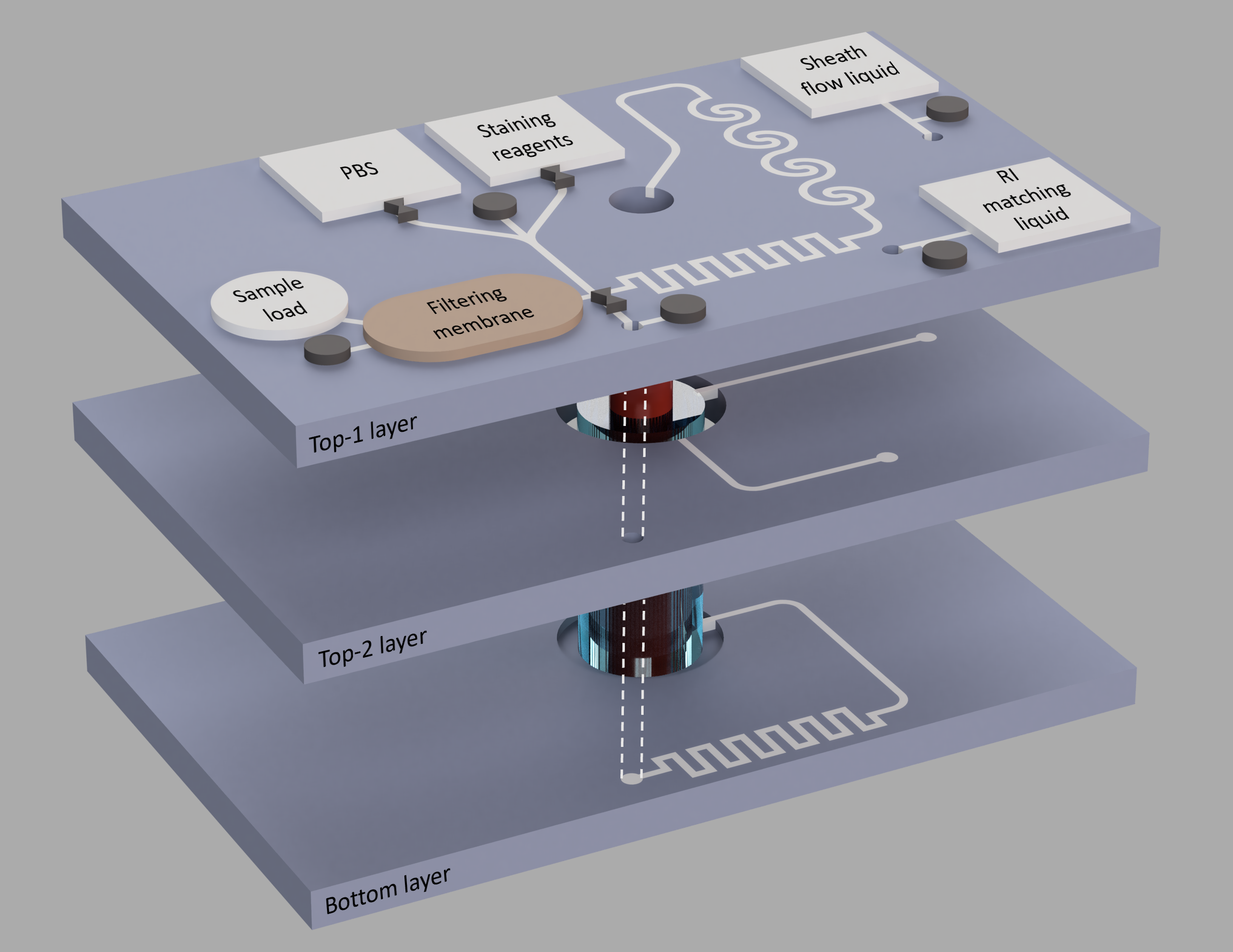 Flow cytometry (FCM) serves as the primary sensing method for detecting and classifying particles by size in blood samples. Optical coherence tomography (OCT) functions as a secondary modality, providing micro-imaging of the sensing area and implementing a coherent gate to significantly reduce noise in FCM measurements. Fluorescence sensing is employed as the third modality, enabling the detection of target biomarkers on EV surfaces after staining with fluorescent dye. PHOREVER introduces a number of key innovations, summarized through the following 8 objectives: