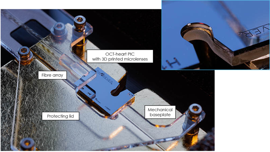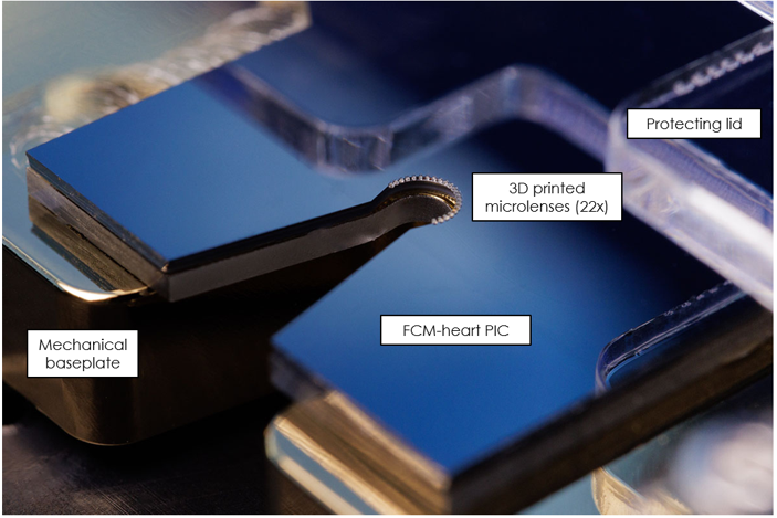 WP5 : The consortium implemented advanced processes for packaging and assembly, achieving vertical stacking of FCM and OCT PICs with high precision and integrating fibre arrays capable of handling high optical power. A modular packaging concept was defined, providing flexibility for assembly, maintenance, and upgrades.