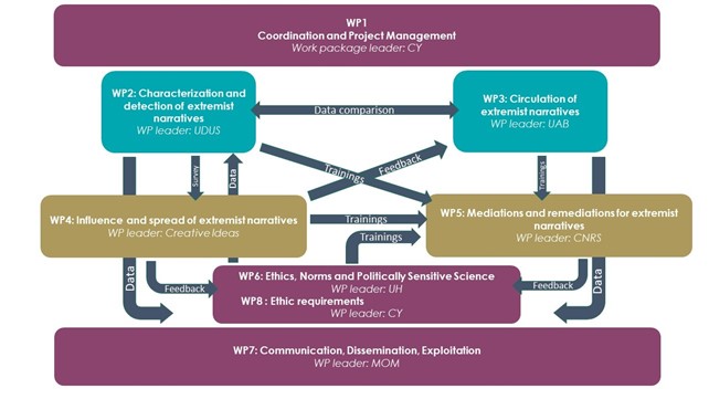 The second one will focus on the characterisation and detection of extremist narratives, the third one on the circulation of extremist narratives, the fourth one on the influence and spread of extremist narratives, and the fifth one on the mediations and remediations for extremist narratives. They respectively aim to answer the next questions: what is an extremist narrative and how can citizens detect it? By which means are those extremist narratives able to navigate between people and countries? How are they spread and how citizens can be impacted by them? How can we mitigate the coming of new extremist narratives and reduce the consequences of past ones? That is why ARENAS stands for Analysis of and Responses to Extremist Narratives.