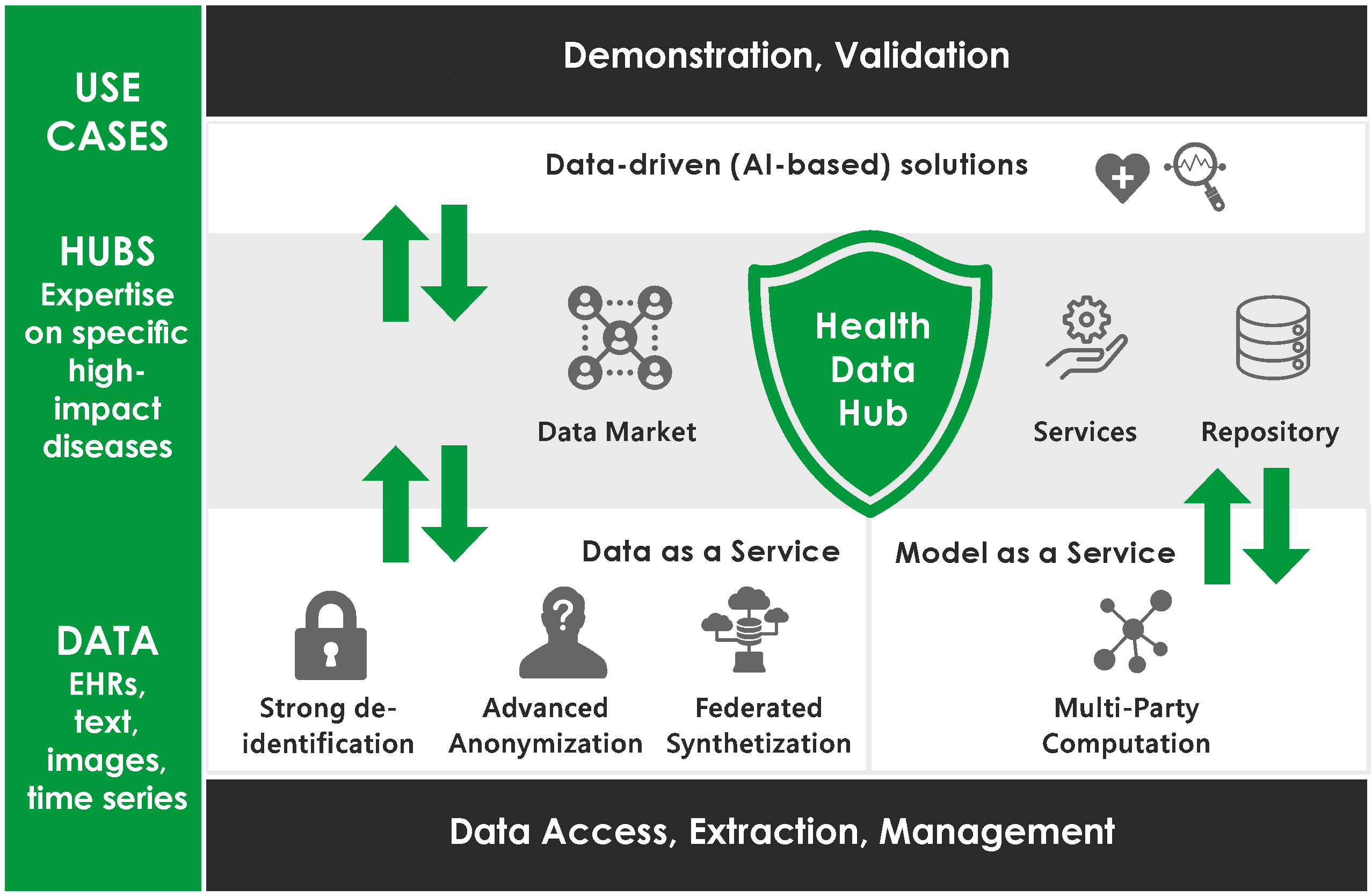 Secure, privacy compliant data utilization is key for unlocking the full potential of AI and data analytics. Companies developing AI solutions would benefit from synthetic microdata for early-stage development, provided on-demand and with privacy guarantees. For researchers and clinicians interested in aggregate data or modelling, multi-party computation allows deriving insights from the distributed real-world data. In this way, providing synthetic data and multi-party computation as a service will boost data-driven innovation without compromising the privacy of data subjects.