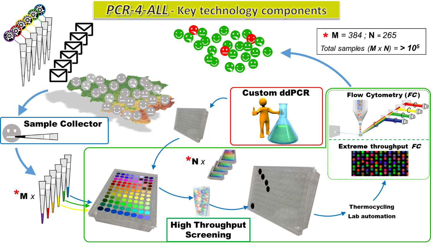 - a method enabling massively parallelized testing with minimum amounts of reagents and samples. To address this, PCR-4-ALL will develop specialized microfluidic technology and associated liquid handling robotic technologies for ultrafast identification of PCR results in a digital manner.