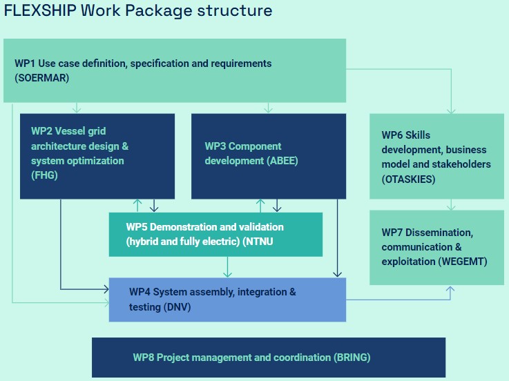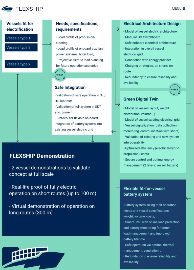 The overall goal of FLEXSHIP is to develop and validate safe, reliable, flexible, modular, and scalable solutions for electrifying the waterborne sector. This includes the following: designing and developing modular battery packs, ensuring safe on-board integration of the battery system and its electrical distribution grid with the vessel’s existing power grid, optimizing the energy management system (EMS) to maximize operational flexibility and energy efficiency for both fully electric and hybrid solutions, implementing smart control to improve the lifespan of the battery system and critical power components.
