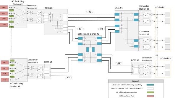 The demonstrator is defined in Deliverable 3.1 (cable-based 5 interconnected terminal HVDC system, with offshore DC-connected power park modules as shown in figures 7_1 and 7_2). The 2 variants have the same subsystem make-up but are reconfigured to test all anticipated interactions.