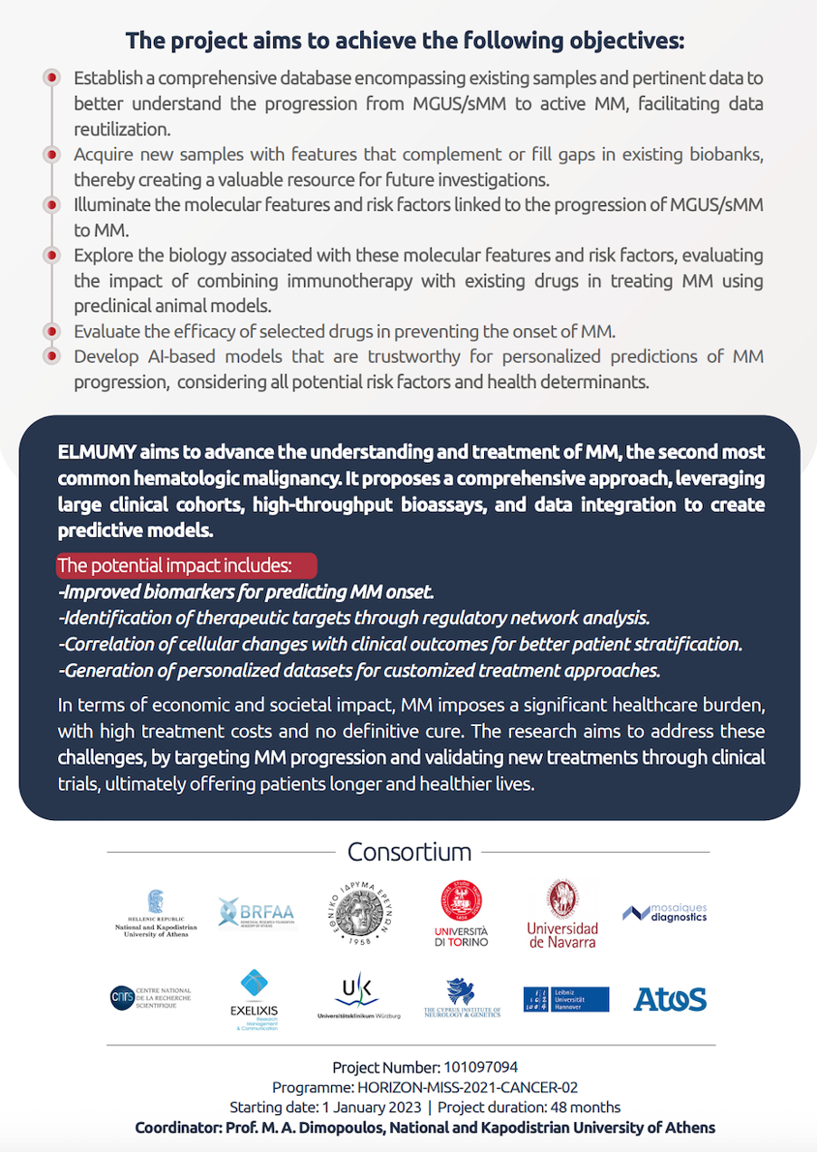 Application of omics technologies, and bioinformatics approaches on highly annotated samples obtained from all informative states (monoclonal gammopathy of undetermined significance [MGUS], smoldering MM [sMM], active MM [MM]) could identify biological pathways and molecules responsible for the onset, progression and resistance to therapy of Multiple Myeloma. In parallel, particular emphasis will be given to elucidating the health determinants and risk factors associated with progression to active MM from MGUS/sMM by using extensive demographic, lifestyle and exposure datasets.