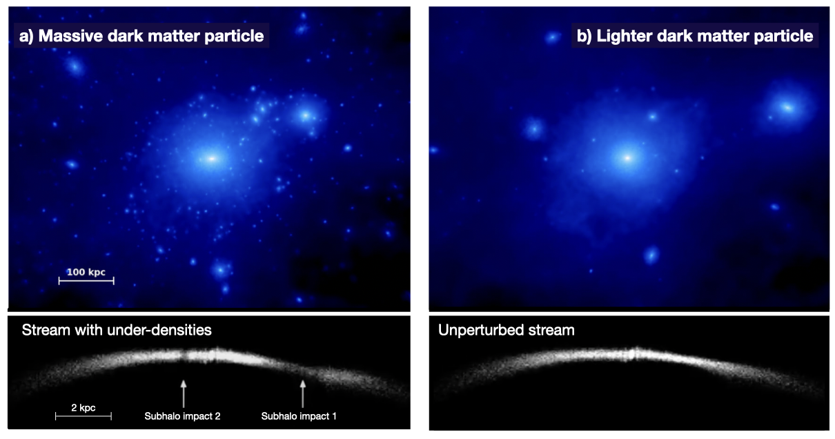 Dark matter forms large halos around galaxies, with many smaller clumps called subhalos. The characteristics of these subhalos depend on the properties of dark matter particles. If dark matter is made of light particles, it moves quickly in the early universe and forms fewer clumps. Conversely, if it's composed of massive particles, it moves slower and clumps together more easily. Since dark matter doesn’t interact with light, we can’t see it directly. Instead, we study its effects on visible matter, such as stars.