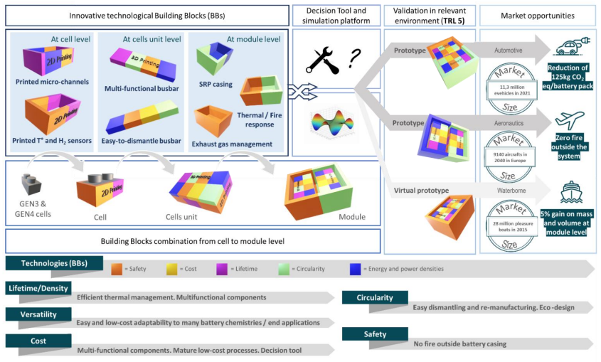 In addition, VERSAPRINT will implement a Decision Tool to choose the most optimised configuration for a given application (in terms of BBs, of cell chemistry…). The BBs used individually or in combination depending on end-user requirements, will be demonstrated at TRL5 for key applications: