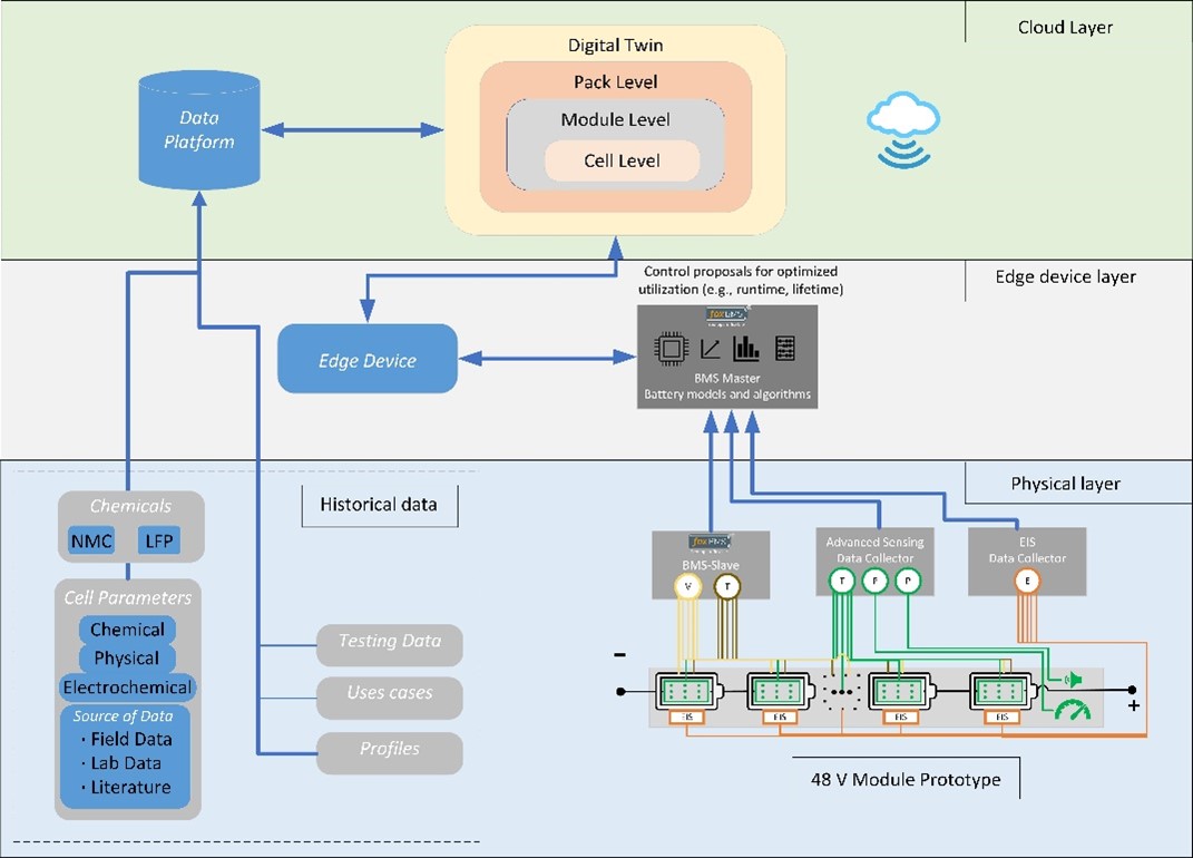 Hybrid and AI-driven models to optimise lifetime and management of the battery (BMS): BATMAX is to set up, in collaboration with project partners, a joint data platform for the project to enable full scale data-driven research. This includes tools for data pre-processing and data fusion. To complement the physics-based models by data-driven approaches towards hybrid models for further inclusion in the scalable and modular digital twins. The ambistion of the activity is to develop AI-driven prognostics for the BMS, covering SoX estimation for local operation (edge-level), and even to take a step into research of a self-learning BMS that utilises data from cloud-level for optimal battery pack operation, therefore pointing to bidirectional edge-cloud framework.