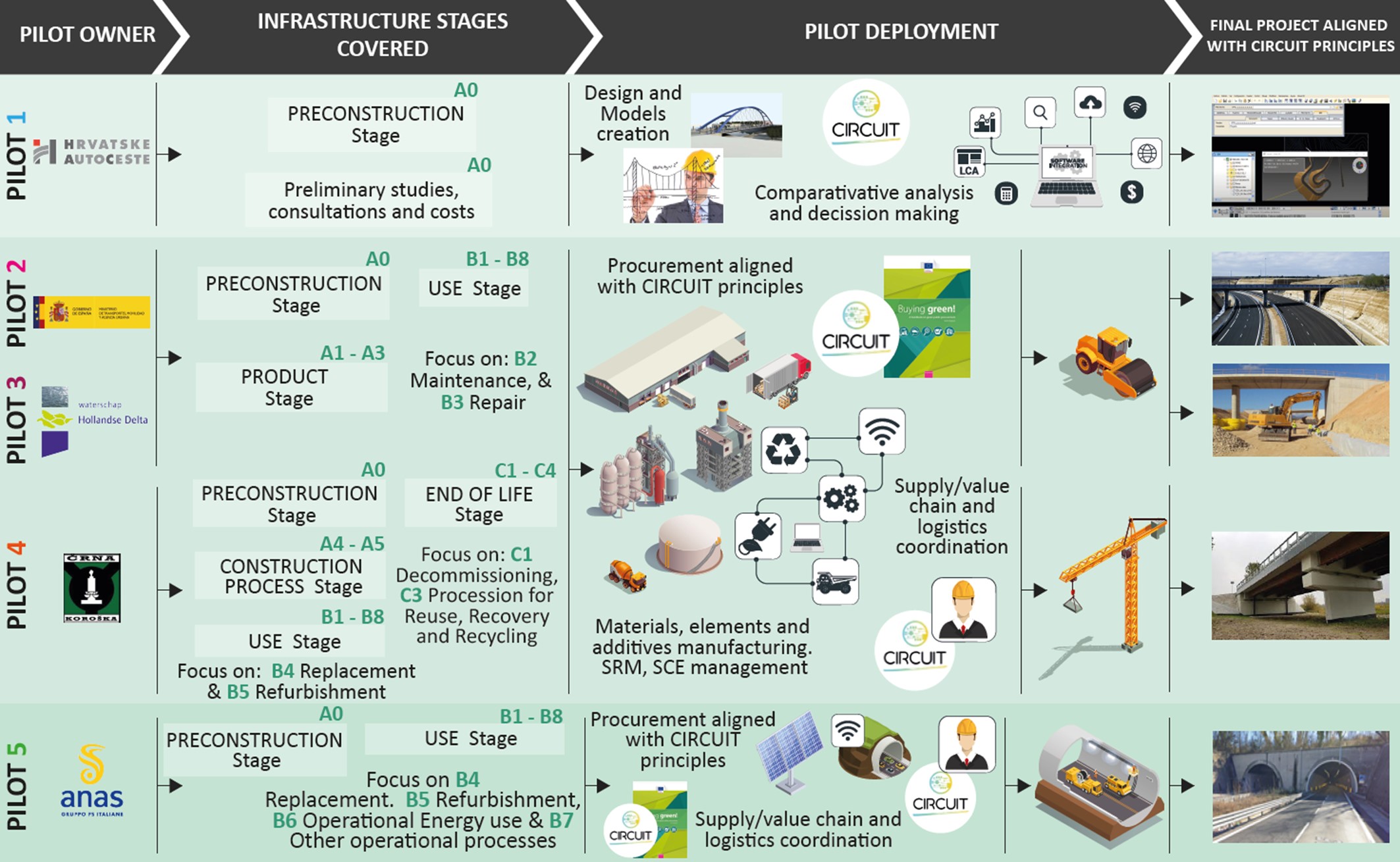 CIRCUIT is structured around four main pillars: Digitalisation, Recycling, Reuse, and Energy, and providing knowledge and technical solutions to consider properly the whole life cycle of transport infrastructure, limiting the overall emissions and energy consumption associated to construction, maintenance, operation and decommissioning of infrastructures. Different technologies are being validated in each of the pillars to deliver a holistic approach suitable for different transport modes, the urban and interurban environment, and the different stages of the life cycle of infrastructures. This potential is going to be proved in five demonstration pilots to be implemented in different EU countries, covering roads, embankments, tunnels, and bridges infrastructure.