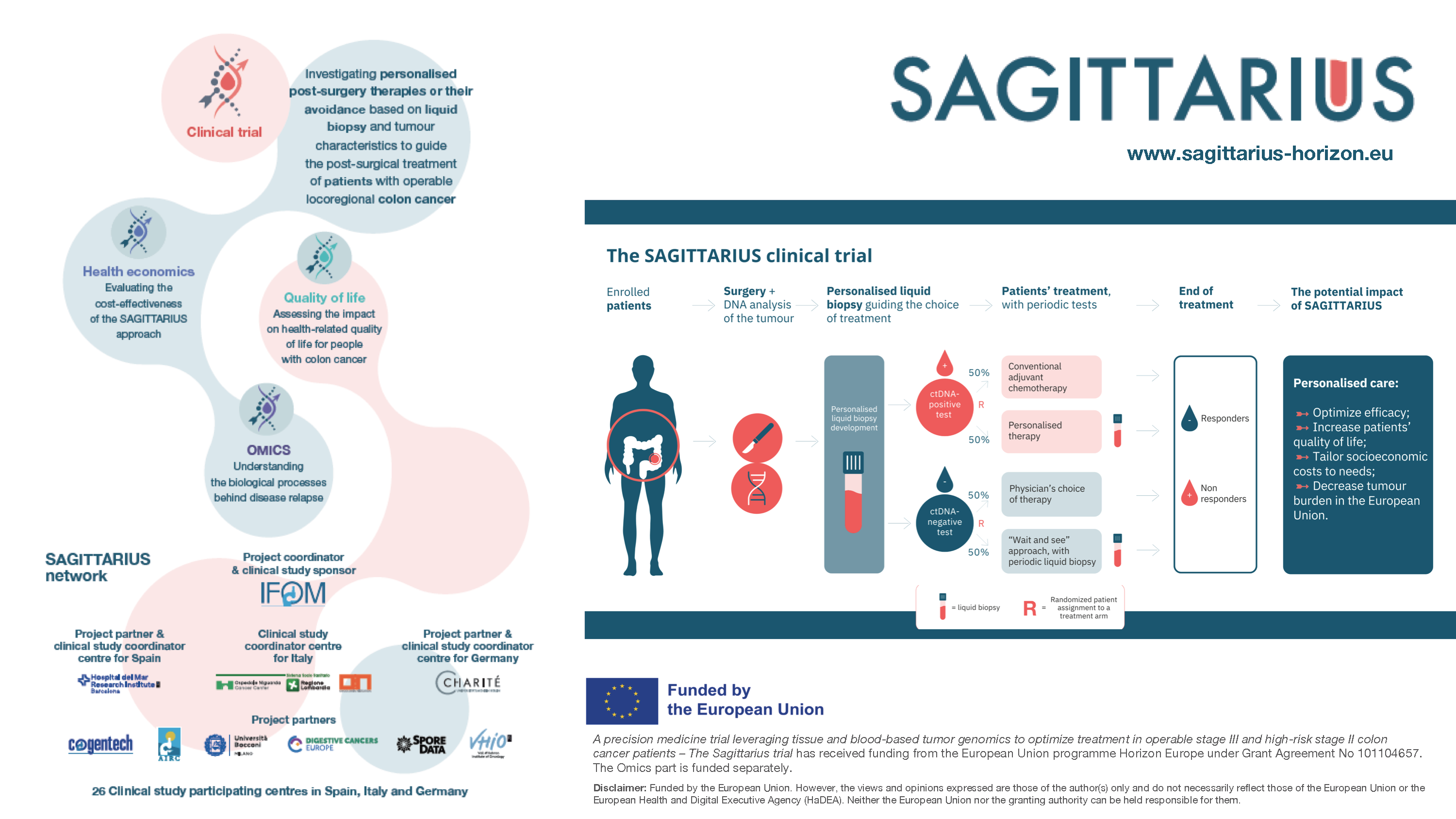Approximately half of all patients diagnosed with locoregional stage II high-risk/stage III colon cancer (LRCC) relapse within two years from the time of curative surgery because of imaging-undetectable micro-metastatic residual disease (MMRD). Given the lack of reliable predictors of individual risk, LRCC patients are treated with one-fits-all adjuvant chemotherapy. This gunshot approach results in either over- or under-treatment. SAGITTARIUS aims to optimize the clinical management of LRCC patients by leveraging circulating tumor DNA (ctDNA) measurement in the patient’s bloodstream to diagnose MMRD and genomic landscape characterization of the patient’s tumors to personalize treatments. SAGITTARIUS is a pragmatic trial whereby real-world patients are treated in two parallel trials based on their MMRD status and the genomic landscape of their tumors. ctDNA-positive patients are randomized to conventional or personalized targeted therapy. ctDNA-negative patients are randomized to either a physician-choice path or Wait&See strategy. Sagittarius will allow for treatment to be better matched against the tumor biology, also allowing for better monitoring – via ctDNA – to assess disease evolution in each patient, minimizing harm and maximizing the odds of cure. The efficacy and effectiveness of this potentially ground-breaking new strategy of care will be measured via multiple outcomes, including safety and time-to-event variables, patient-reported outcome measures, and health-economics evaluation.