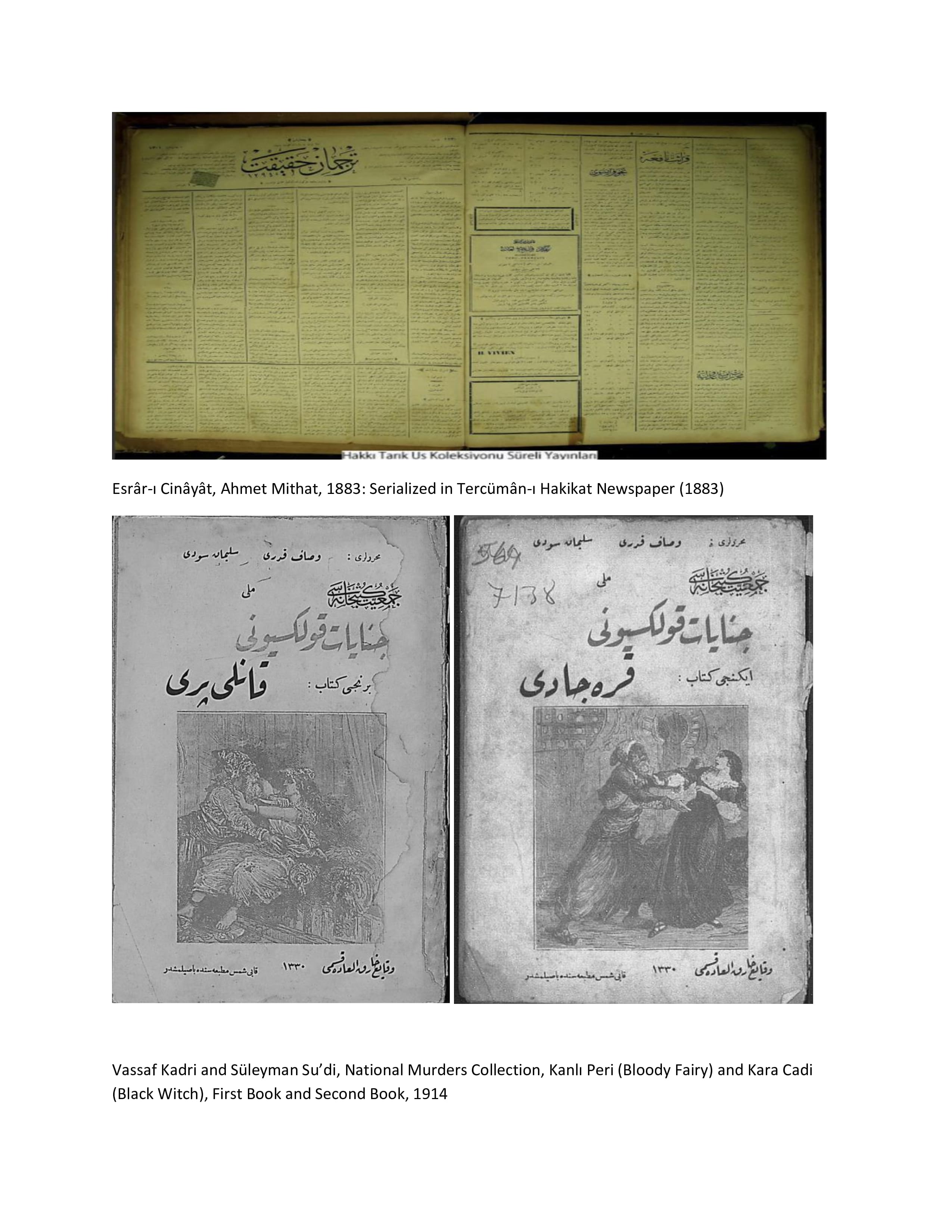 While many works featured marginal or symbolic female characters, only a limited number placed female perpetrators at the center of their narratives. After an extensive survey of the period’s literary production, I selected five representative texts that not only span this fifty-year timeframe but also reflect distinct ideological, narrative, and stylistic shifts: İntibah (1876) by Namık Kemal, Esrar-ı Cinâyat (1884) by Ahmet Mithat, Milli Cinâyat Koleksiyonu (1914) by Vassaf Kadri and Süleyman Sudi, and two early Republican dime novels by Peyami Safa, Tilki Leman (1926) and Çekirge Zehra (1928).
