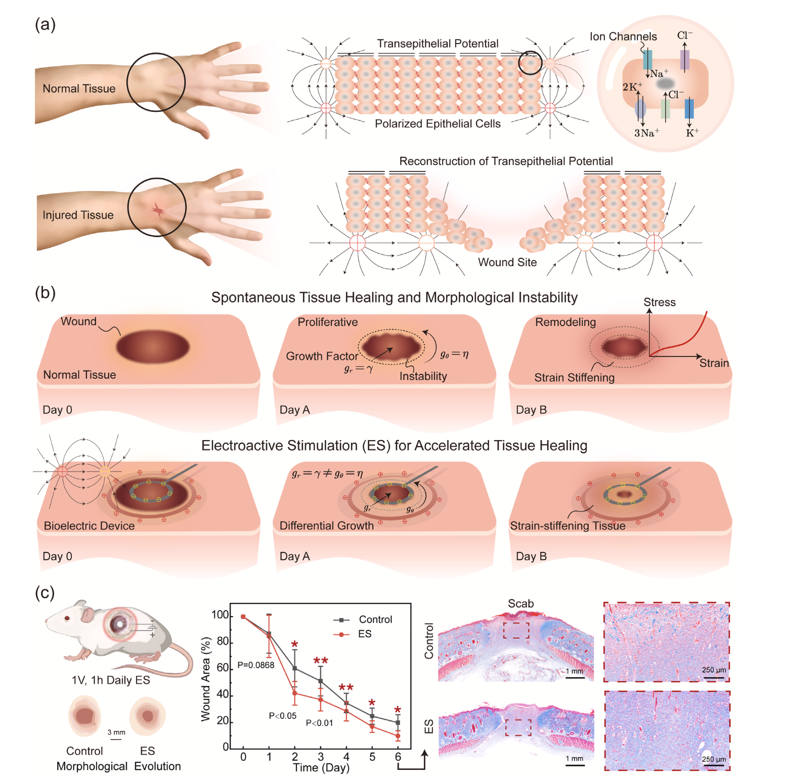 A novel morpho-electroelastic theory was formulated to couple differential growth, large deformation elasticity, and electric stimulation. This model successfully predicts instability modes and growth thresholds under voltage, with in vivo validation demonstrating accelerated wound healing in animal models. The theoretical formulation and biological confirmation mark a significant advance over existing uncoupled or purely phenomenological models.