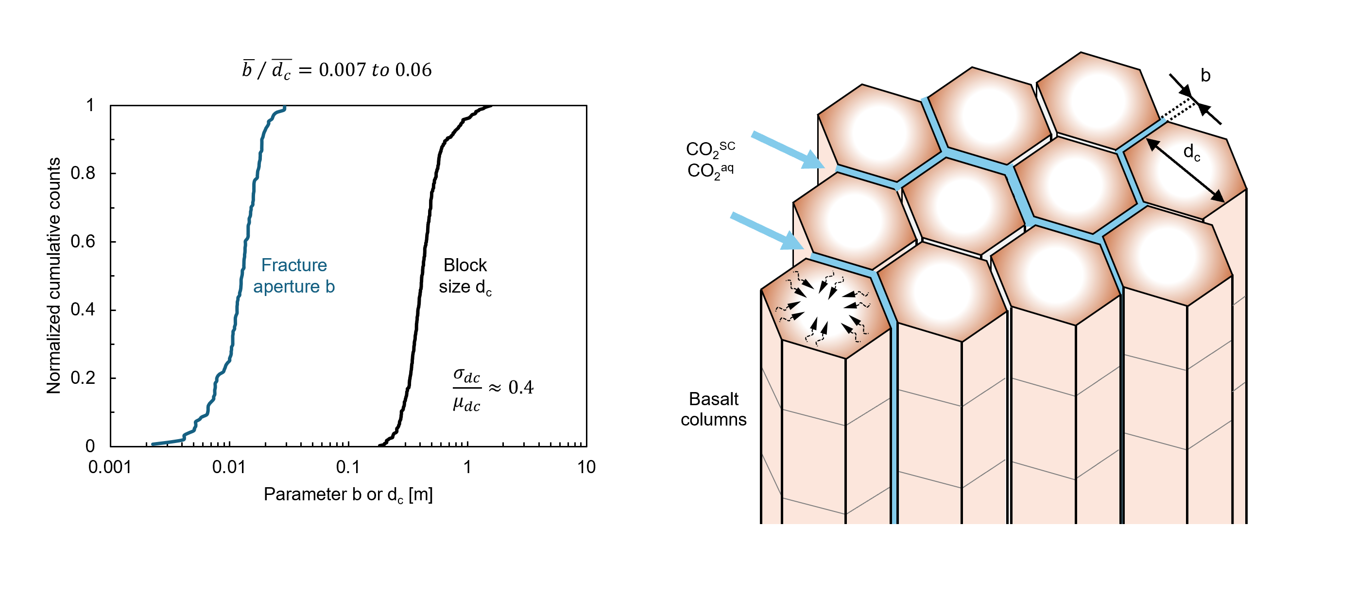 • Fine-grained and fractured mafic basalts are strong candidates for CO2 storage. Their fracture networks are shaped by mineralogy, formation history and cooling rates. Block size (dc) and fracture aperture (b) follow log-normal distributions (σ/μ ≈ 0.4) with aperture proportional to block size (β = b/dc), typically ranging from ~0.007 to ~0.06 depending on mineralogy.