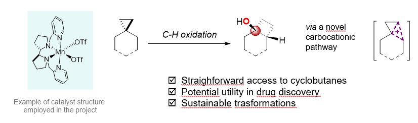 The oxidation of carbon-hydrogen (C–H) bonds in simple organic molecules is a key chemical transformation. This is because many biologically active and pharmaceutical compounds contain oxidized frameworks, and introducing carbon-oxygen (C–O) bonds into these molecules allows for the creation of a wide range of useful products. In recent years, scientists have made great progress in designing catalysts—substances that speed up chemical reactions—that mimic the behavior of natural enzymes, especially a class called oxygenases. These enzymes are particularly good at oxidizing C–H bonds in living organisms. Moreover, the use of environmentally friendly metals (such as manganese or iron) to synthesize these catalysts, making the process more sustainable. Oxygenase enzymes can carry out C–H oxidations through different mechanisms. One common route, called the rebound mechanism, involves replacing a hydrogen atom on the molecule with an oxygen atom. Another possible pathway involves an electron transfer, which creates a positively charged intermediate known as a carbocation. This carbocation can then lose a proton and form a new structure. A particularly useful trick involves the use of cyclopropyl groups—small three-carbon rings. These rings can make nearby C–H bonds more reactive through a process called hyperconjugation, which helps guide the reaction to a specific site on the molecule. Cyclopropyl groups also help stabilize carbocation intermediates, making it possible for reactions to proceed through carbocationic pathways. Until recently, however, there was no direct evidence that these carbocation-based pathways could lead to actual reaction products. In collaboration with Costas group, the fellow studied the oxidation of a cyclopropane substrate called 6-tert-butylspiro[2.5]octane. They discovered for the first time that the reaction produced one major product: a cyclobutane ring (a four-carbon ring), formed through a highly specific rearrangement involving a carbocation. These findings opened the door to designing more selective and efficient oxidation reactions using cyclopropane-containing compounds, with the potential to create new molecules in a greener and more controlled way.