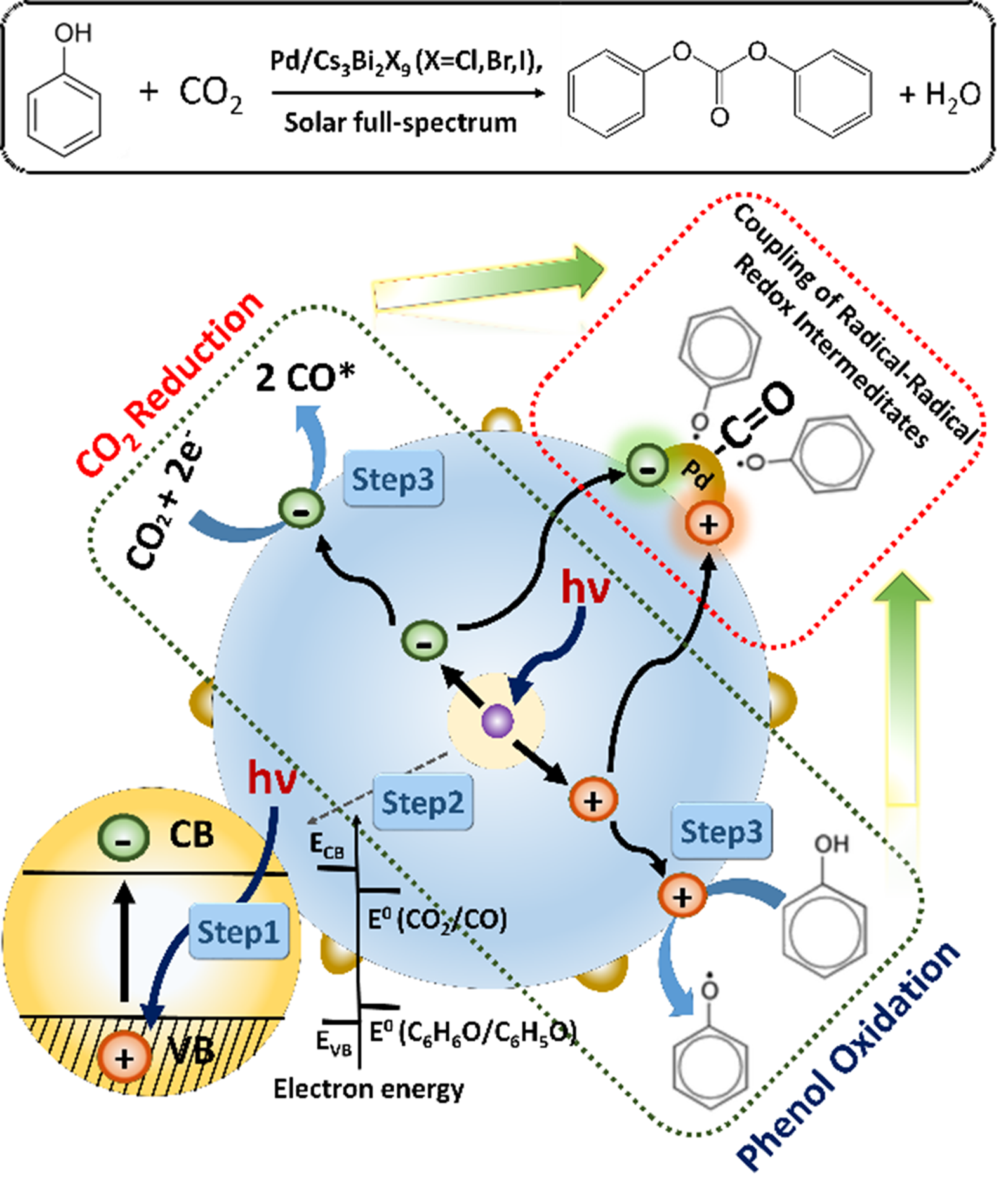 2. Demonstrating solar-mediated formation of key intermediates, including phenoxy radicals (PhO•) and carbon monoxide (CO*) from phenol oxidation and CO2 reduction, enabling tandem diphenyl carbonate (DPC) synthesis.