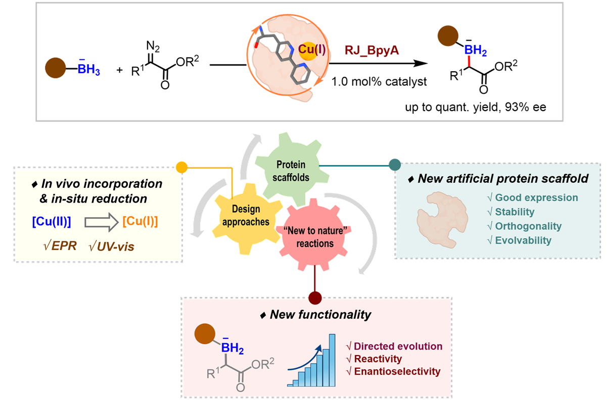 1. Developed A New Strategy for Constructing Artificial Copper(I) Enzymes: The applicant has, for the first time, combined gene-encoded unnatural amino acids with an in-situ reduction strategy to successfully construct an artificial copper(I) enzyme with catalytic activity.
