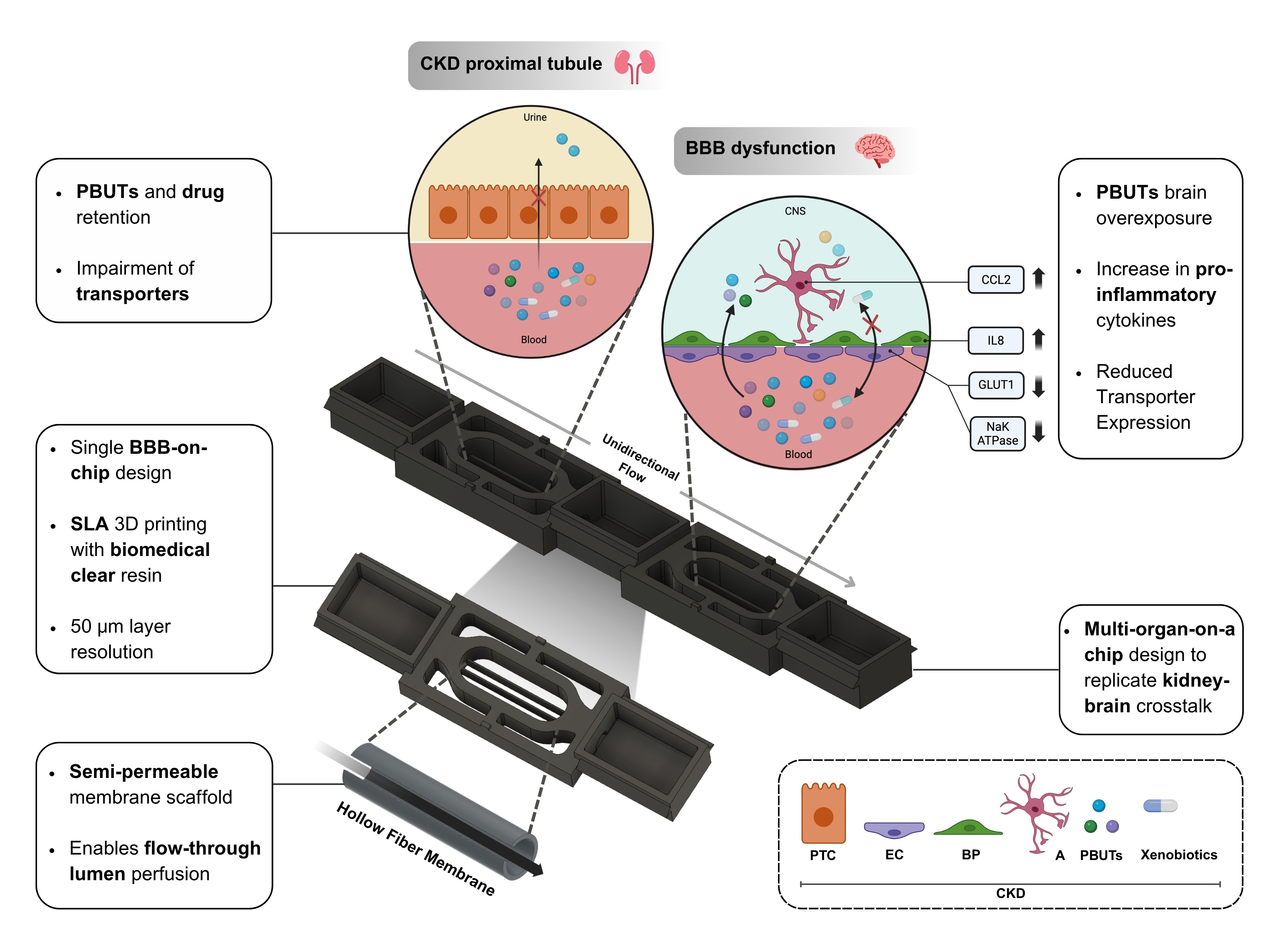 Research hypothesis, objectives and collaborative network: I hypothesize that the reduction in kidney tubular transporters’ functionality in CKD leads to (1) the systemic retention of protein-bound uremic toxins (PBUTs), (2) a disruption of the blood-brain barrier (BBB) integrity and (3) a reduction in the activity of BBB-endothelial cell (BBBec) membrane transporters. This phenomenon could play a part in the evolution of CKD-associated neurological pathologies (e.g. uremic encephalopathy and cognitive impairment) driven by the kidney-brain crosstalk impairment. This project aimed to develop an appropriate and innovative multi-organs-on-chip model to decipher underlying mechanisms of CKD-induced neurotoxicity. The project was achieved using a combined biofabrication and experimental approach, following research objectives: