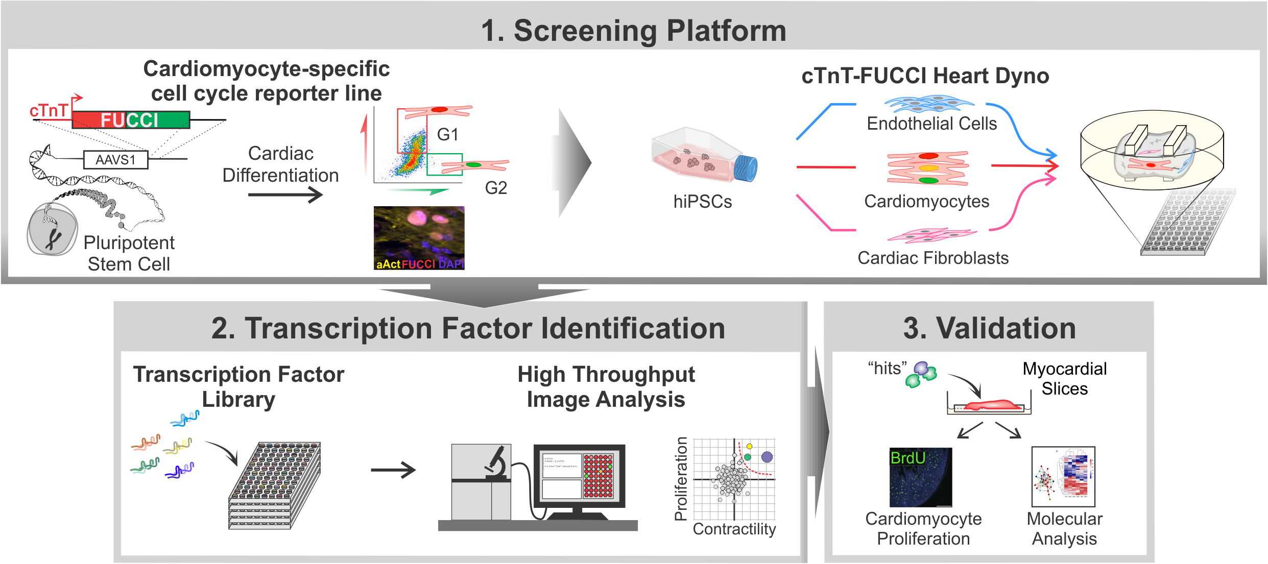Firstly, TraFICa aims to develop a high throughput screening platform to study heart cell proliferation in 3D structures, grown from stem cells, that recapitulate the human heart. Next, this screening platform will be used to Identify a protein cocktail that stimulates proliferation in heart cells within these 3D structures. Finally, we will validate the protein cocktail in an ex vivo myocardial tissue culture system.