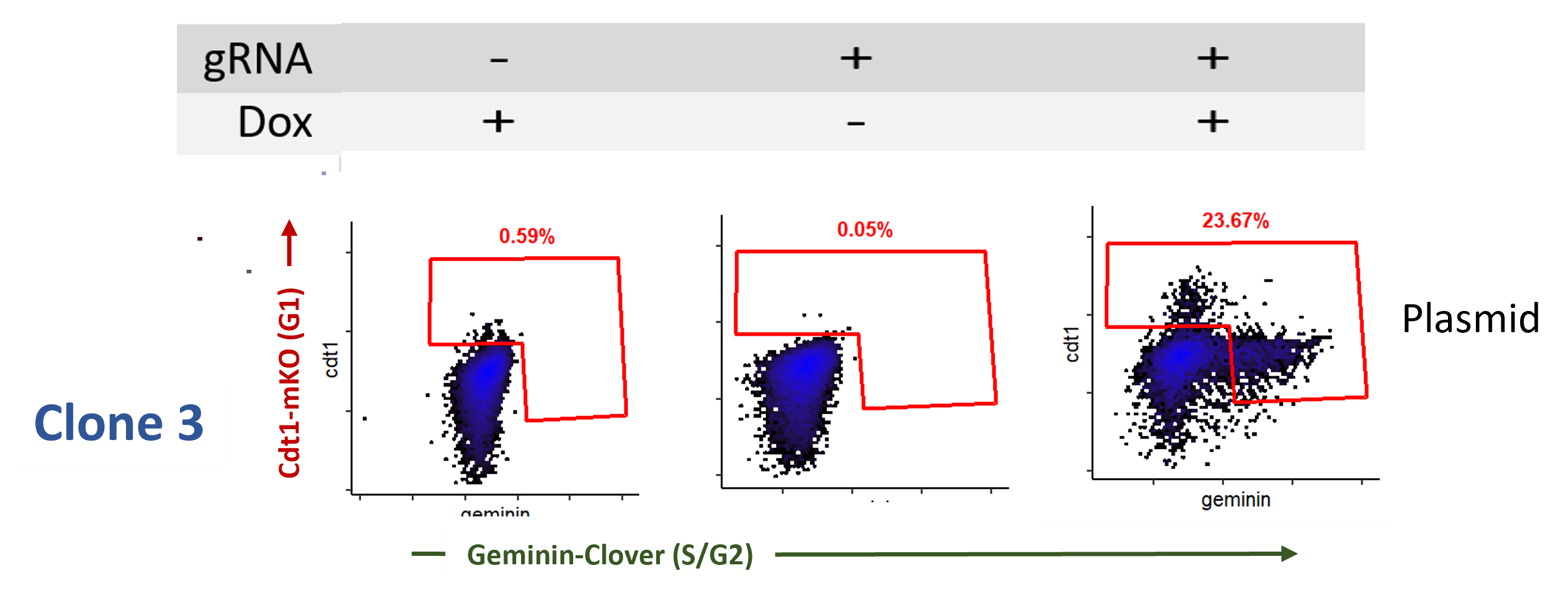 We integrated a Cas9-VPR transgene in the second AAVS1 allele. The Dox-inducible expression of Cas9-VPR was confirmed by westernblot. Functionality of the Cas9-VPR system was shown by the forced expression of the FUCCI reporters in iPSCs. Optimization lead to the activation of the cTnT-driven FUCCI transgene in roughly 25% of the iPSCs.