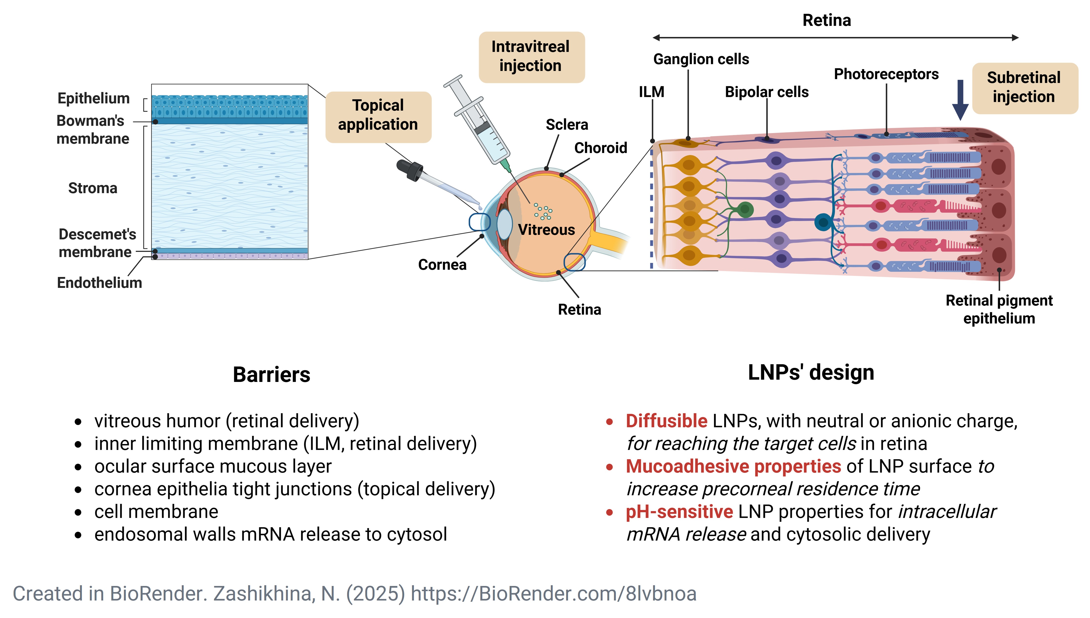 Our research project aimed to develop lipid-based nanoparticle (LNP) systems that are specifically tailored for mRNA delivery into the corneal, conjunctival and retinal cells. The project addressed the critical anatomical and physiological barriers of ocular mRNA delivery topically and intravitreally.