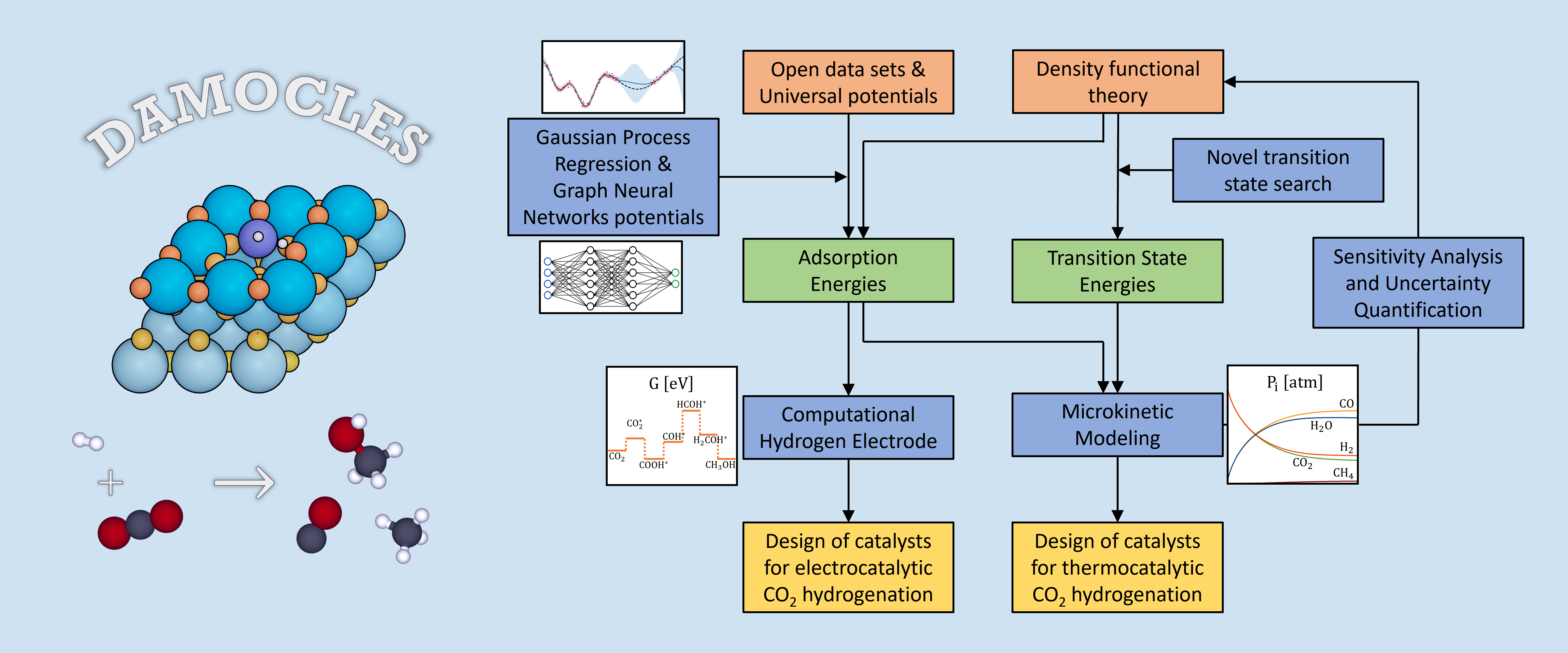 The overall objective of the DAMOCLES project is to advance computational catalysis by applying data-driven modeling (i.e. DFT combined with ML) to study and tailor metal oxide catalysts for CO2 hydrogenation, in search of new catalytic materials with improved performances (i.e. activity, and selectivity). By leveraging machine learning, the project seeks to model the underlying quantum mechanical principles of catalysis on oxide materials using small numbers of calculations, enabling the efficient and accurate prediction of other systems. This approach will help establish kinetic models of catalytic activity, guiding experimental efforts. In the outgoing phase of the project (first year), the postdoc Raffaele Cheula is hosted by Prof. John Kitchin at Carnegie Mellon University (USA). In the second year of the project, he returns to Aarhus University (Denmark) under the supervision of Prof. Mie Andersen.