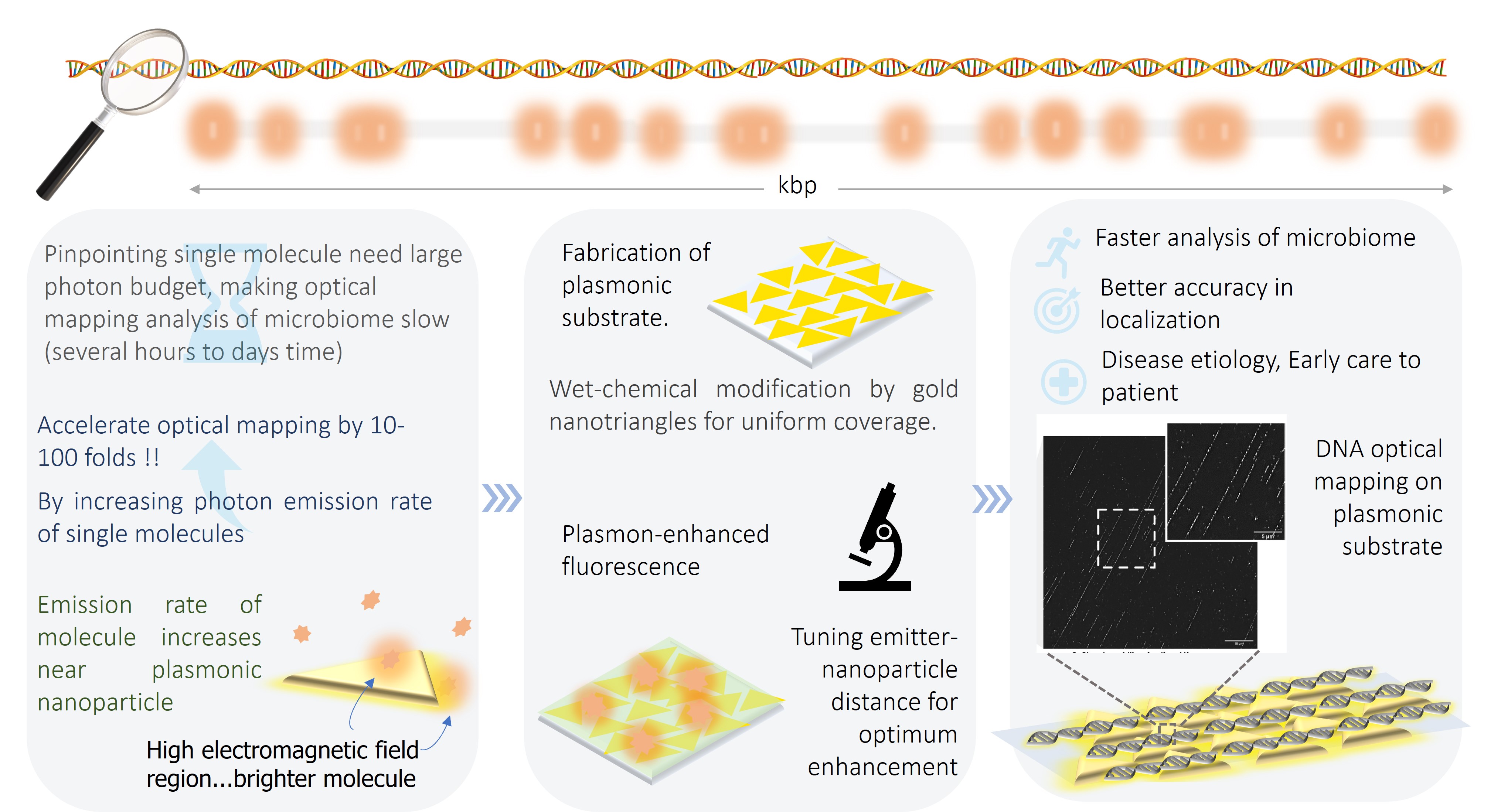 The developed plasmonic substrate represents a valuable outcome of the project. It offers a versatile and scalable platform for enhancing fluorescence signals and could be applied beyond DNA mapping, including in single-molecule sensing, imaging, and other nanophotonic applications. Although full optical mapping of labelled microbiome DNA could not be completed within the project timeframe, the scientific groundwork including substrate fabrication, fluorescence enhancement validation, DNA stretching, and theoretical modeling provides a strong foundation for further development. These results contribute to broader efforts to create faster and more precise tools for molecular-scale analysis.