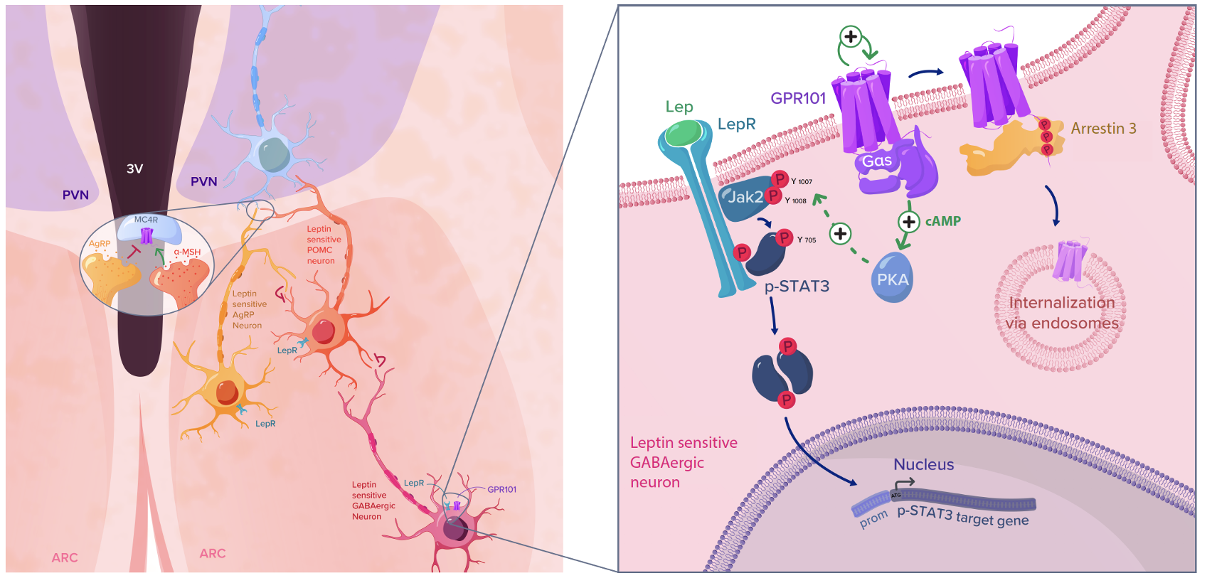 Obesity is recognized as a major burden to public health as it increases the risk of several chronic diseases, like diabetes, cardiovascular diseases or some cancers. Therefore, there is substantial interest in developing safe, effective anti-obesity medications. Typically, obesity develops when energy from food intake chronically exceeds energy expenditure. Energy homeostasis is centrally regulated by the hypothalamus; a brain region filled with several interdependent nuclei. The hypothalamus regulates an impressive number of vital functions such as body temperature, appetite control, sleep-wake cycles/circadian rhythm and somatic growth. The arcuate nucleus (ARC) located at the base of the hypothalamus, is thought to orchestrate the regulation of feeding behaviors and energy balance. Two neuronal populations of the ARC are considered as the first-order neurons mediating the effects of various signals (such as leptin and insulin), the orexigenic neuropeptide (NP)Y/Agouti-related peptide (AgRP) neurons and the anorexigenic pro-opiomelanocortin (POMC)/Amphetamine-regulated transcript (CART) neurons. Leptin is an adipocyte-secreted peptidic hormone that inhibits food intake and regulates body weight. Within the ARC, leptin binds to the isoform b of the leptin receptor (LepR) which signals mainly by activating kinases of the janus family to phosphorylate signal transducers and activators of transcription 3 (STAT3). Phospho(p)-STAT3 promotes the release of POMC and CART while inhibiting the secretion of other neuropeptides such as NPY and AgRP. Noteworthy, POMC is cleaved to give rise to multiple peptides such as alpha melanocyte stimulating hormone (αMSH). αMSH mainly acts on neuron expressing melanocortin 4 receptors (MC4R) in the paraventricular nucleus (PVN) to suppress appetite. Loss-of-function mutations in the genes that encode LepR, POMC or MC4R lead to persistent hunger and obesity in both humans and rodents. In nearly all forms of obesity, circulating levels of leptin increase but fail to suppress food intake and body weight. This condition has been identified as “leptin resistance”, and one of the identified mechanisms arises from the impaired LepR signaling (through SOCS3 notably) by reducing both p-STAT3 levels and αMSH production and release upon leptin administration. Despite our knowledge of the principal circuits regulating feeding, satiety, hunger and energy expenditure, we have been unable to deliver effective drugs targeting directly these systems. Most of the pharmacotherapeutic interventions to induce weight loss have so far proven dangerous or ineffective. However, Glucagon-like peptide (GLP)-1 receptor agonists, Semaglutide and Liraglutide, have recently proven that safe pharmacological reduction of body weight was a practicable therapeutic option. The failure in targeting the melanocortin pathway comes out partly from an incomplete understanding of leptin action, especially leptin resistance, at the central level.