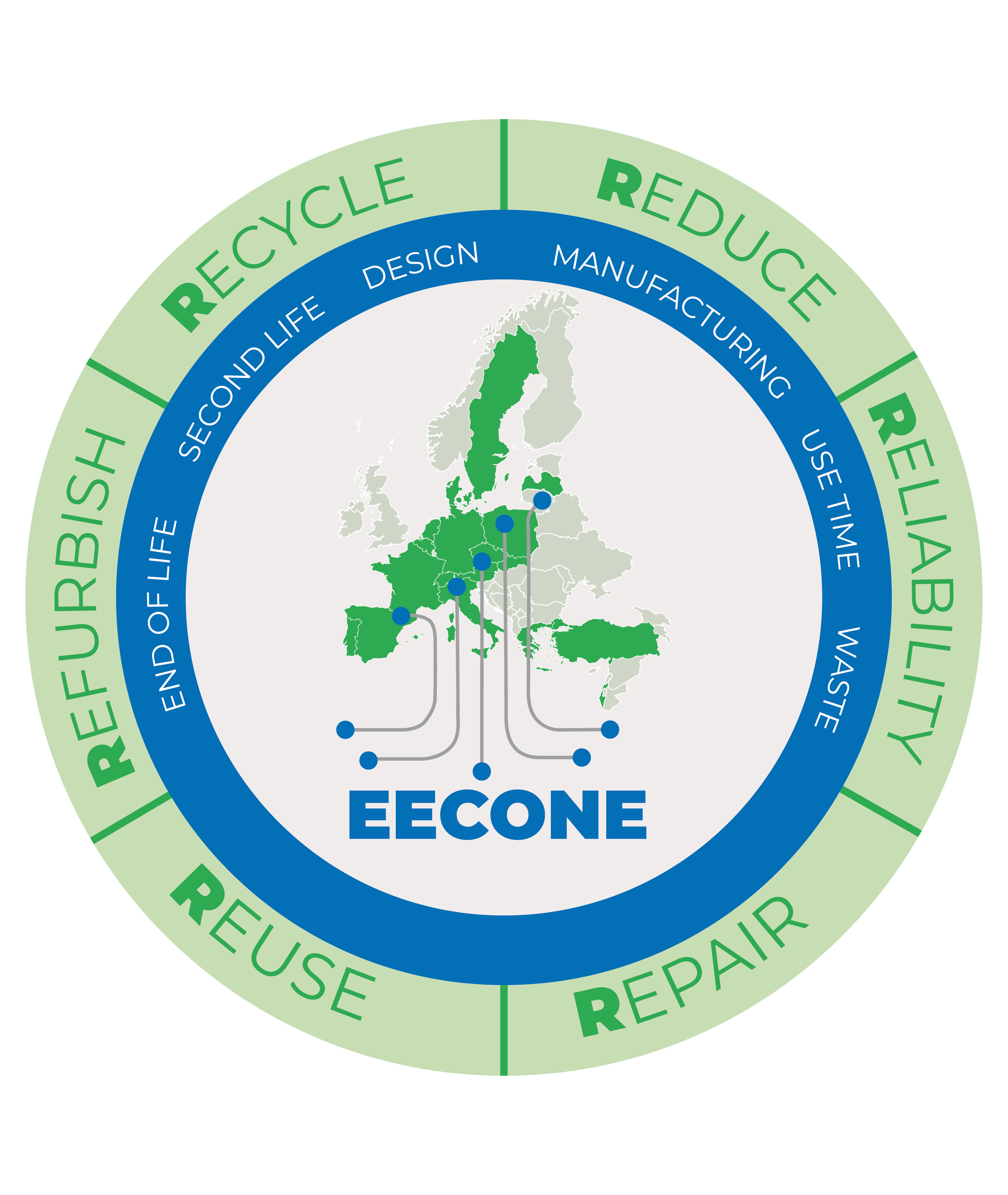 EECONE’s vision is to develop and embed the constraints linked to managing the end-of-life of electronic products from the very beginning – in the development or process design. EECONE is paving the way as a first step toward a zero-waste electronic industry. The “6R concept will fully guide EECONE” (Reduce, Reliability, Repair, Reuse, Refurbish, Recycle).