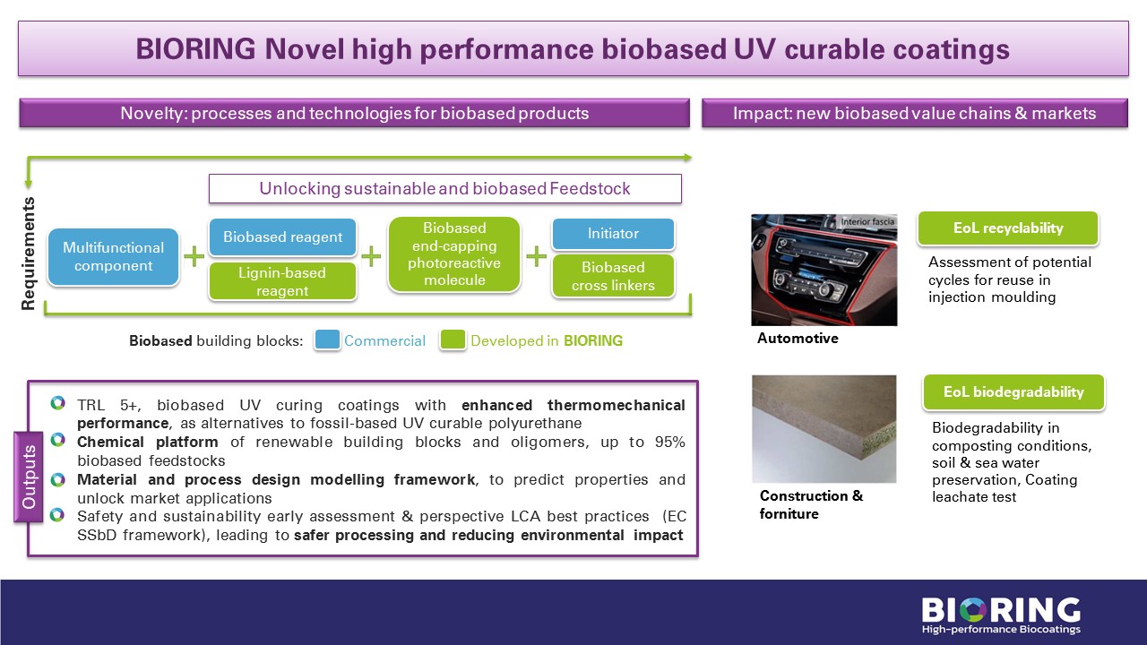 BIORING develops biobased building blocks that allow the formulation of novel high-performance biocoatings with enhanced thermomechanical performance, providing a viable alternative to existing fossil-based ones. Their recycling and biodegradability are tested in view of end-of-life (EoL) real scenarios.