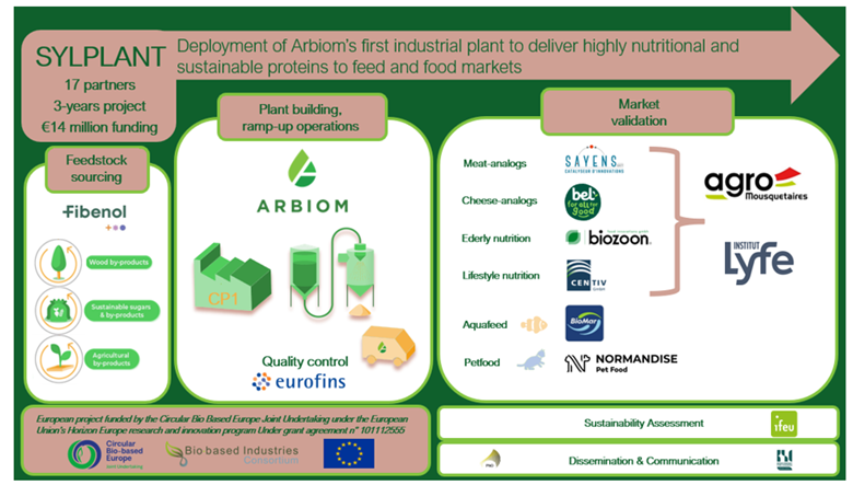SYLPLANT lead partner, Arbiom, has developed protein-rich food (Yusto) and feed (SylPro) ingredients combining underexploited feedstock such as agricultural or forestry residues with yeast. Given the high availability of the feedstock, the ingredients can be produced locally and on a large scale, while the fermentation process minimizes CO2 emissions. The SYLPLANT project goal is to industrially deploy Arbiom’s protein-rich ingredient production while validating its deployment from feedstock to retailers on 3 markets: aquafeed, pet food and Human food. The project will include the sustainability of the value chains in Europe, to contribute to its protein sovereignty.