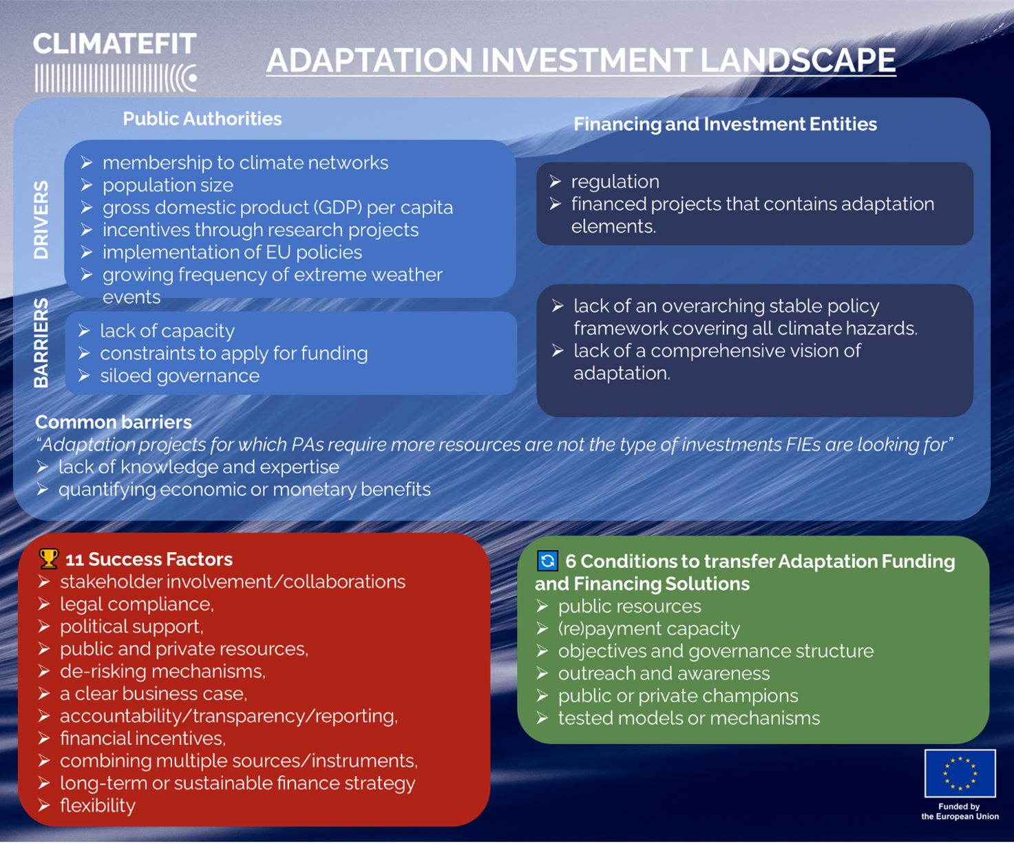CLIMATEFIT experiments on 20 territories in Southern, Eastern and Northwestern Europe in their transformational pathways towards climate resilience. The journey has started by taking stock of funding & financing barriers and enablers gathered in the Adaptation Financing Landscape. CLIMATEFIT is currently creating a Manual for leveraging finance to: 1) co-design 20 innovative investment strategies allowing to identify sources of financing; 2) develop 10 credible and scalable investment plans to help better negotiate and articulate financing streams and define investment concepts, and; 3) pilot 4 bankable, tailored investment cases.