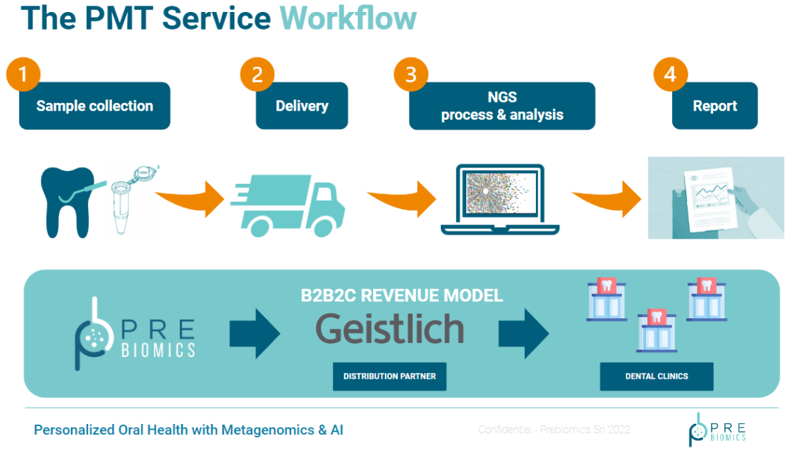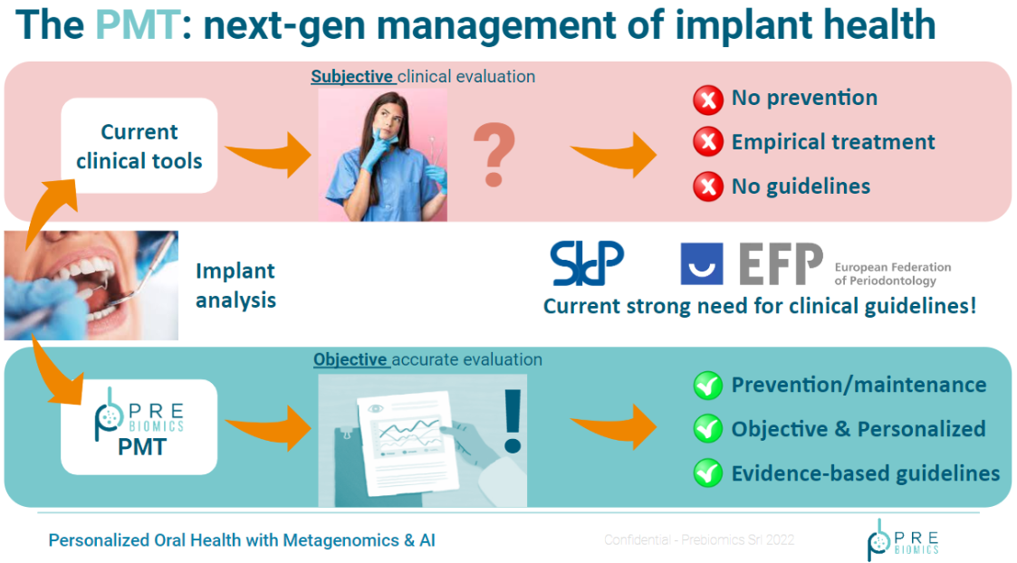 Over 10 years of research, PreBiomics has identified a set of bacteria whose presence and abundance are crucial in predicting the severity and progression of implant infections. Exploiting metagenomics and AI, we are developing a precision-medicine tool called PreBiomicsPMT that analyzes the microbial composition of the plaque collected around dental implants to predict disease progression and provide personalized treatment recommendations for each patient.