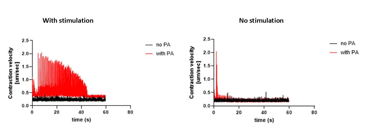 After optimizing the culture conditions, we characterized neuromuscular junction (NMJ) morphology in 14DIV co-cultures via immunostaining and evaluated function by analyzing muscle contractions after light-induced neuron firing. An optogenetic training protocol (blue light stimulation at specific frequencies and intensities) was implemented to strengthen NMJs. Optogenetically trained co-cultures exhibited stronger contractions (Fig. 4), suggesting increased neuron firing enhances NMJ formation and strength.