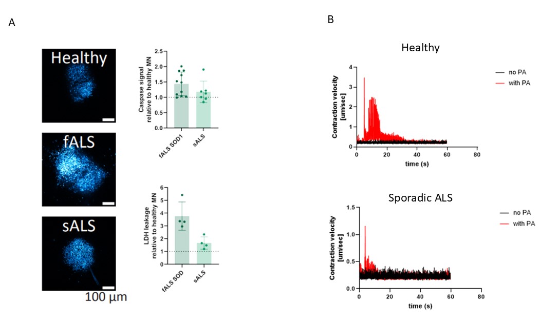 An ALS model was implemented using hiPSC-derived motor neurons from ALS patients with familial mutations (SOD1) and sporadic ALS. After validating the ALS phenotype (Fig. 5), co-cultures were created following the same process. ALS cultures demonstrated lower cell viability and slower muscle contractions compared to healthy controls (Fig. 6).