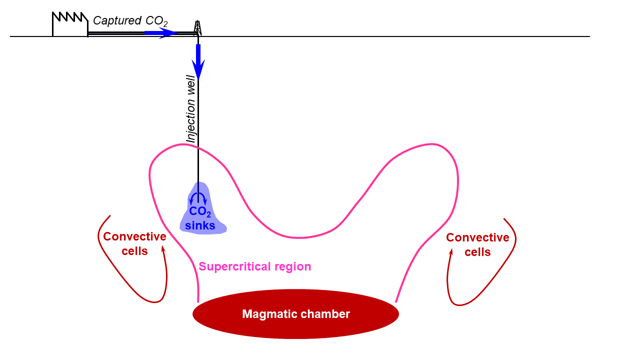 The first task was to simulate in 3D the evolution of groundwater movement induced by the presence of a high-temperature magmatic chamber. Groundwater heats up and lighter when it gets in contact with the magmatic chamber, forming a rising convective cell. Previous numerical calculations of the shape of the convective cell to estimate the location of supercritical resources had been made in 2D plane-strain geometries. In CO2SINk, we have performed pioneering 3D numerical simulations of the effect of the presence of a high-temperature magmatic chamber on the hydrothermal development of a convective cell. We have found unexpected results, with the shape of the convective cell significantly differing from that resulting in 2D simulations. Our findings show a convective cell that grows above the perimeter of the magmatic chamber, but that sinks above its central part. This finding has important implications for deciding the best location of the wells to reach supercritical water. Drilling above the centre of the magmatic chamber may result in unsuccessful wells not reaching supercritical conditions of water. In contrast, wells drilled around the projection of the perimeter of the magmatic intrusion have higher chances of finding supercritical water. This finding has implications not only for the CO2 storage concept proposed in CO2SINk, but also for harnessing supercritical water in deep volcanic areas. We have investigated the effect of the shape and depth of the magmatic chamber on the distribution of supercritical water and its evolution over geological time scales. With the discovered shape of the convective cell that is formed above magmatic intrusions, we have performed simulations of CO2 injection within the region where supercritical water is present. Simulation results display a moderate sinking tendency, with the CO2 plume evolving quasi-spherically around the injection well. The other potential risk that has been investigated is the potential of inducing seismicity. We observe a dependency of the induced seismicity rate on the pressure evolution, but a limited effect of long-term cooling in our simulations, which involve injection rates of 1- to 5-million tons per year during 40 years. Nonetheless, we do not disregard that cooling-induced seismicity may become an issue for multi-well injection of cold CO2 over decades. Site-specific studies should be performed to assess the injection rates that do not lead to long-term cooling-induced seismicity.