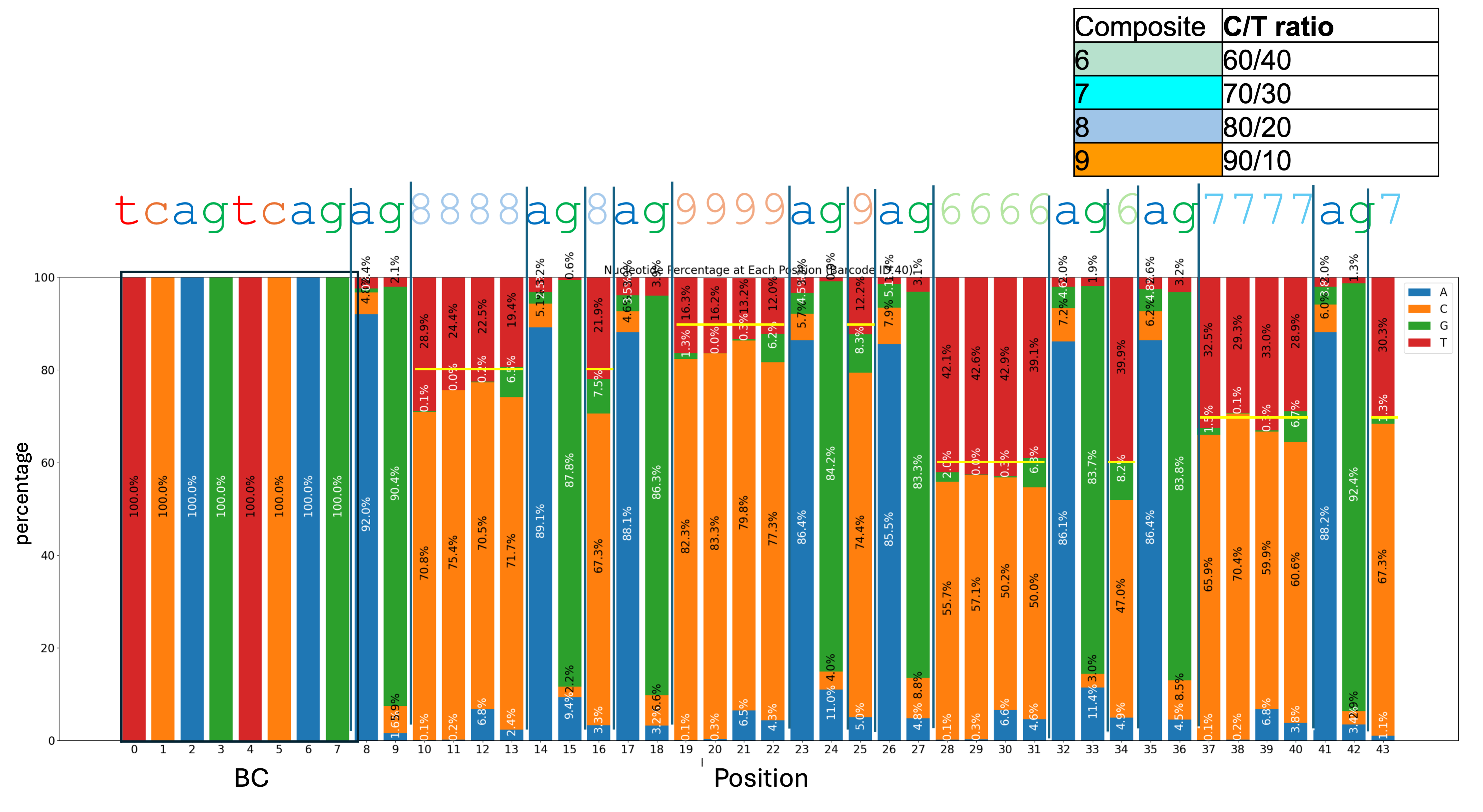 The photochemical synthesis of composite DNA libraries aims to enhance information content per nucleotide. This approach will be evaluated for its efficiency and error rates by comparing premixed and on-the-fly phosphoramidite mixes. It will also explore the use of trimer phosphoramidites for coding one full codon at a time. Trimer strategies, combined with composite synthesis, are expected to achieve a logical density of over 9 bits per cycle, surpassing current large-scale standards.