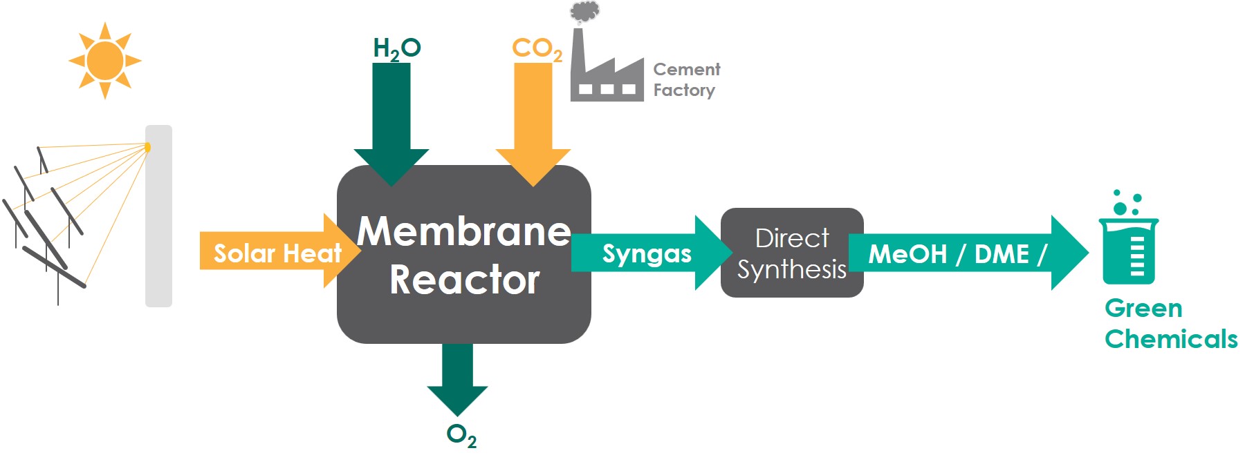 - Development of uniquely scaled-up solar membrane reactor designs to achieve optimal conversion.