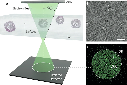 The Stahlberg group (EPFL) has focused on the implementation of low-dose 4D-STEM for proteins and tissue sections. An aberration-corrected STEM was equipped with a TVIPS scan generator, allowing to control the electron beam at highest precision, so that the focussed beam can be stepped over the specimen at very high speed in a random, pre-defined pattern. At the same time, the instrument was equipped with a DECTRIS Arina camera, allowing to record images of 192x192 pixels at 30,000 frames per second. A setup based on SerialEM allowed the semi-automated collection of 4D-STEM datasets of different proteins. The recorded, very large 4D-STEM datasets were then subjected to image reconstruction, using the py4Dstem software that is publicly available under the GPL from a group in Berkeley, USA. This has resulted in first medium-high reconstructions from 4D-STEM, published in a common publication between the Sachse, Müller-Caspary and Stahlberg groups under Küçükoglu et al., Nature Communications (2024).