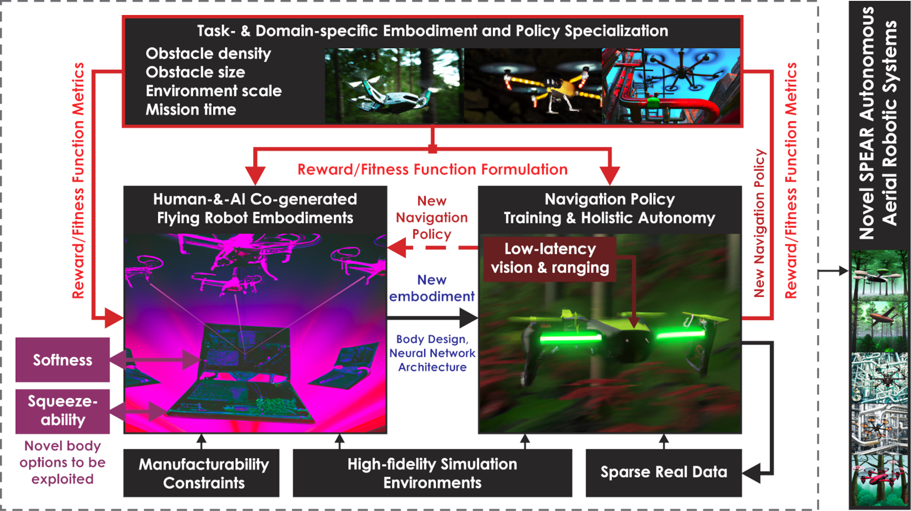 SPEAR aims to revolutionize the field and deliver the vision of mission- and environment-tailored aerial robotics through a collective view of the design of the robots' "body" and "brain," To that end, our research will exploit the synergy of a) evolutionary algorithms, b) a rigid and soft materials, c) complementary robot perception, d) efficient propulsion and e) progress in deep neural networks for navigation strategy learning. The goal is to have AI create novel aerial robots that are more efficient, resilient, and safe through their optimized fit to the mission and the type of environment. This is the grand, disruptive vision of SPEAR. Upon its success, it has the potential to drastically shift aerial robot design from human-conceived creations to automated, task-specific designs.