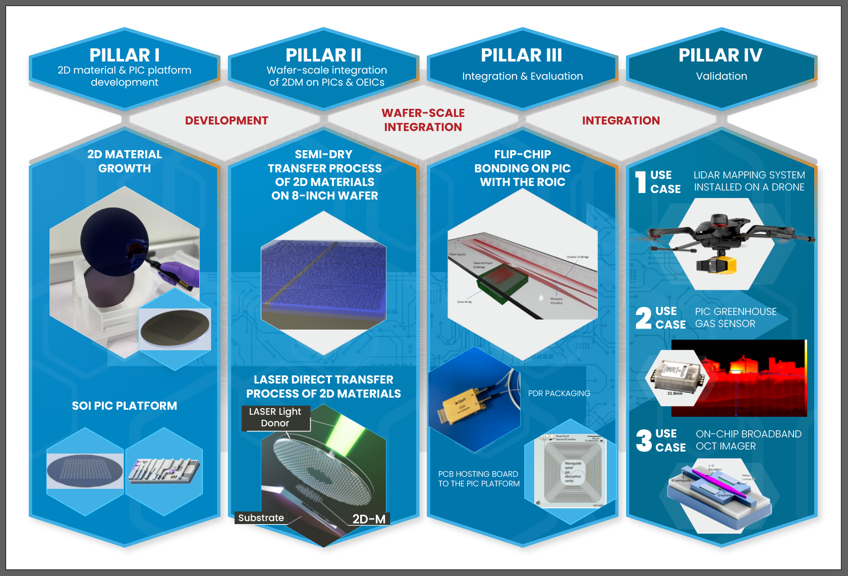 In order to accomplish these objectives, it will advance the current state-of-the-art value chain of technologies, including a Si photonics platform fostering the direct integration of 2D materials, wafer-scale integration of 2D materials, 2D material-based PICs and OEICs, and 2DM-enabled applications:
