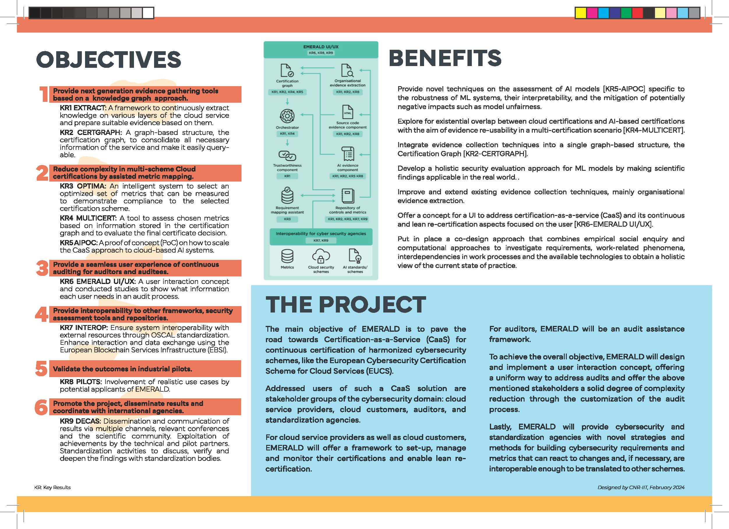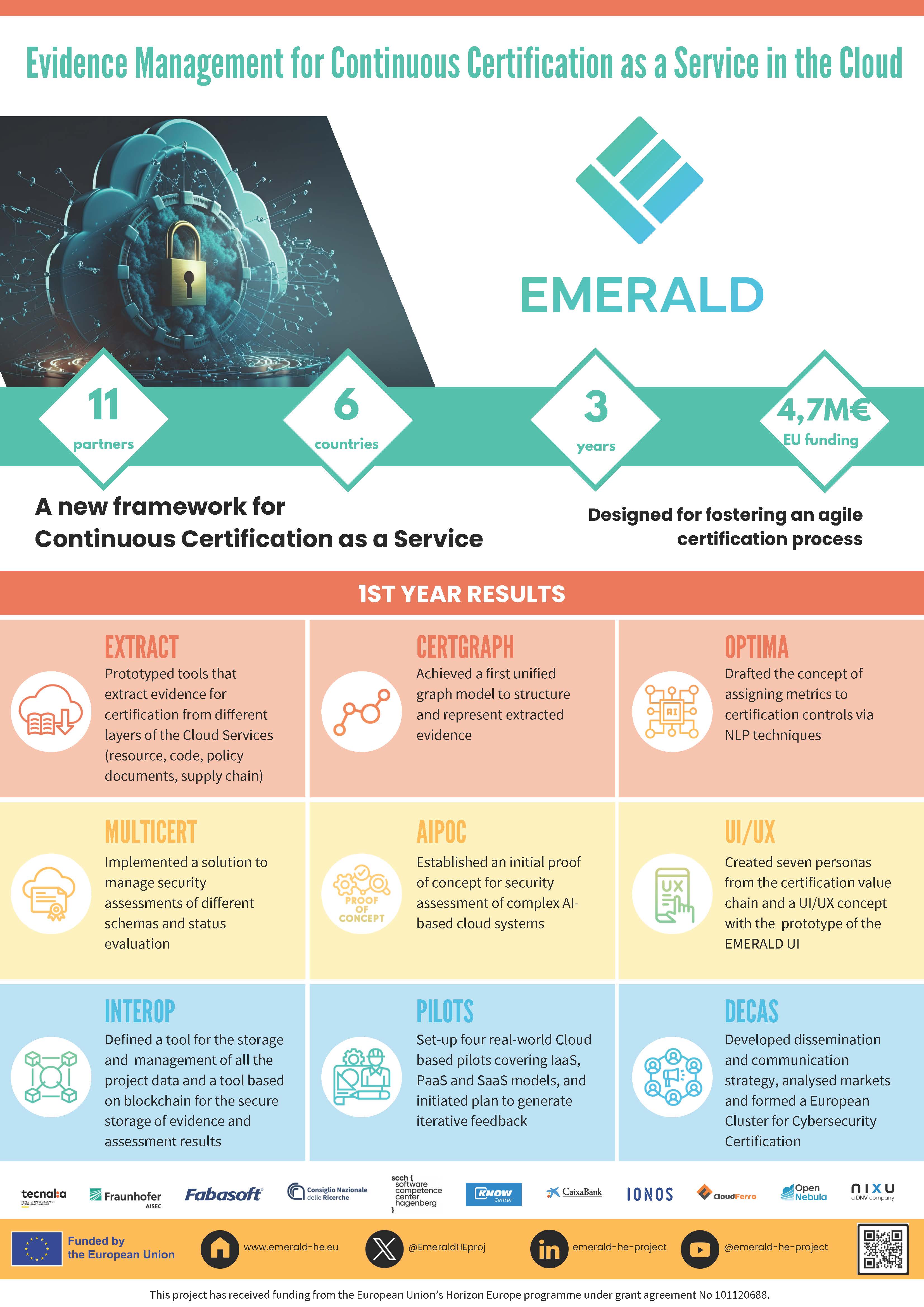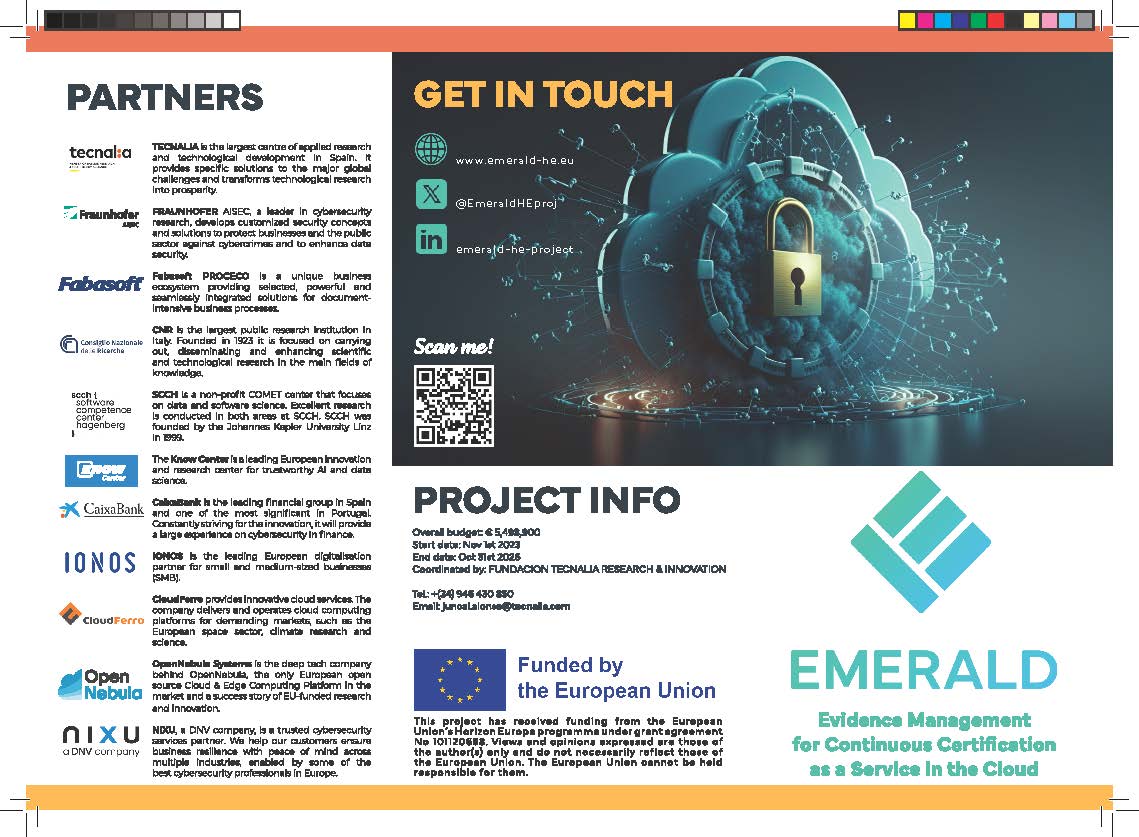 The project also fosters strategic alignment with European initiatives on digital sovereignty, supporting transparency and trust in digital services. By doing so, EMERALD promotes the adoption of secure cloud services across both large enterprises and SMEs, ensuring that security certification becomes a practical enabler rather than a barrier. Ultimately, EMERALD’s vision is to provide a robust, flexible, and forward-looking certification ecosystem, paving the way for more resilient, trustworthy, and user-centric digital infrastructures in Europe.