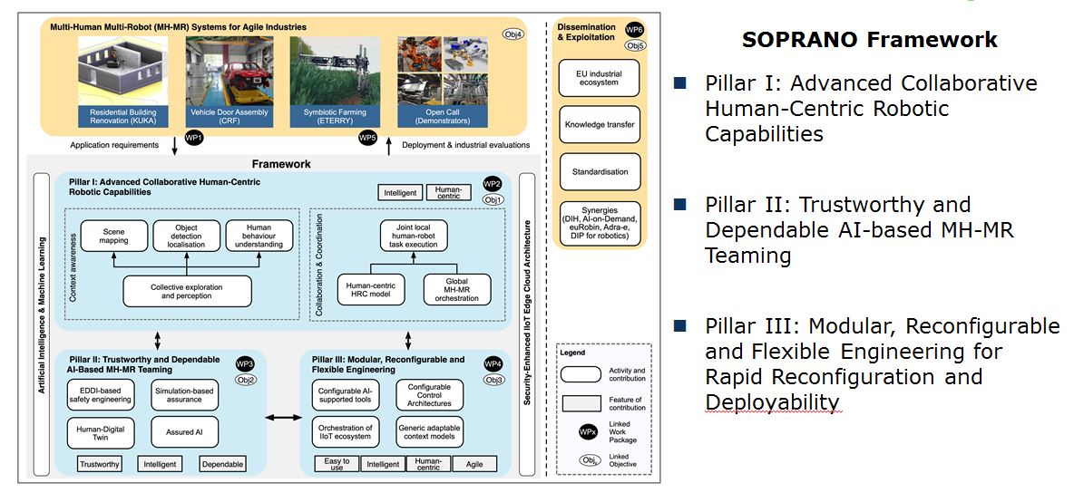 SOPRANO aims to enable a next generation of multi-human multi-robot (MH-MR) systems to support more flexible, resilient and reconfigurable agile processes built on the following innovative technology pillars: