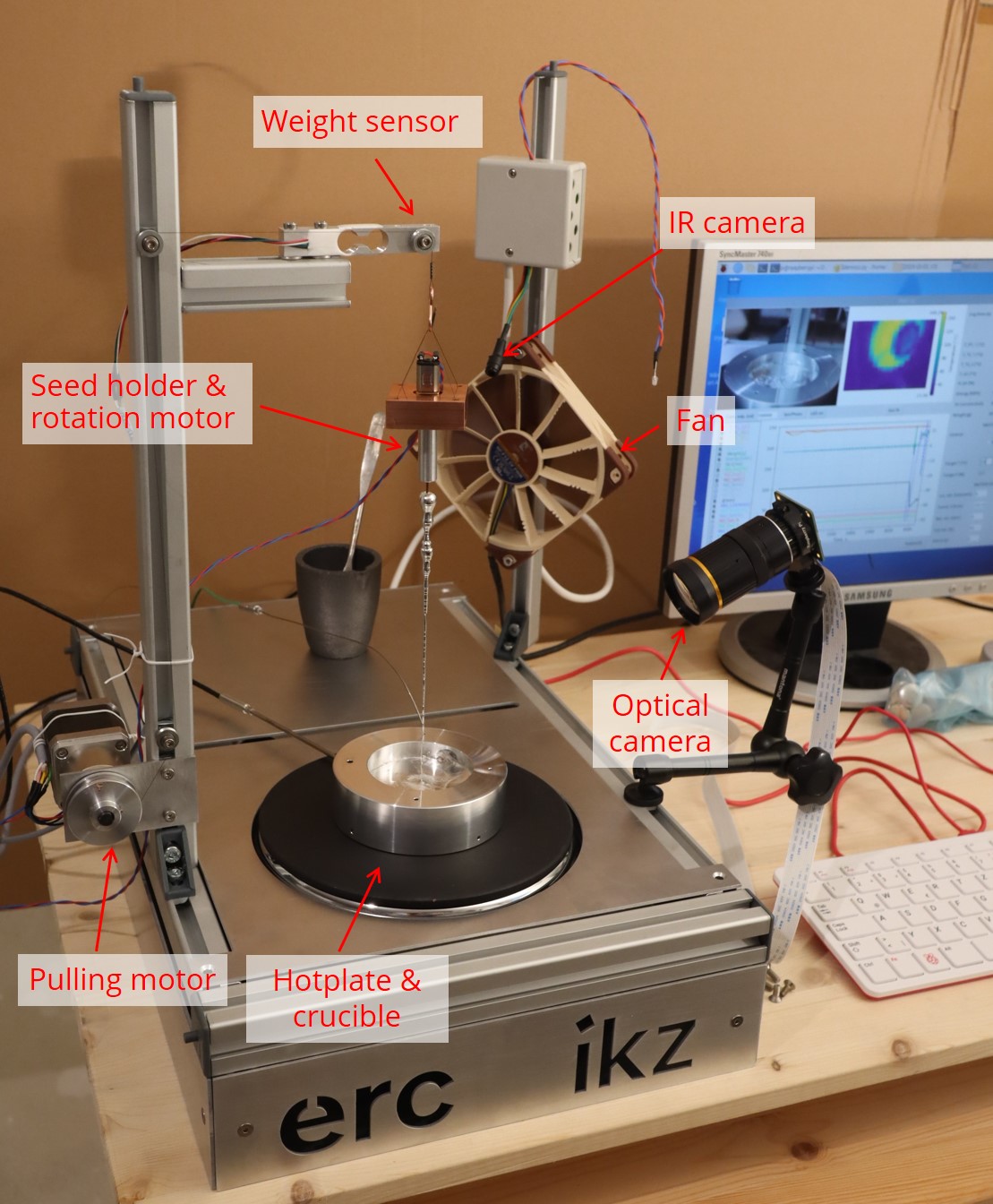 The hardware of EduCrys is controlled by a Raspberry Pi microcomputer, which provides also a convenient graphical interface (Linux operating system) for data evaluation and documentation. The control SOFTWARE has been implemented in Python, which is a widely known scripting language and is taught already at school level. An intuitive user interface with a single graphical window contains an overview of all sensor inputs including a time plot and camera images. Beyond the basic control of the hotplate and motors, the interface also supports programmable recipes for the experiments. The developed software was significantly simpler and much more user friendly compared to the command-line interface with an Arduino microcontroller in the former Demo-CZ setup. A future update may also include a more flexible, modular script design and remote control, e.g. using a smartphone app.