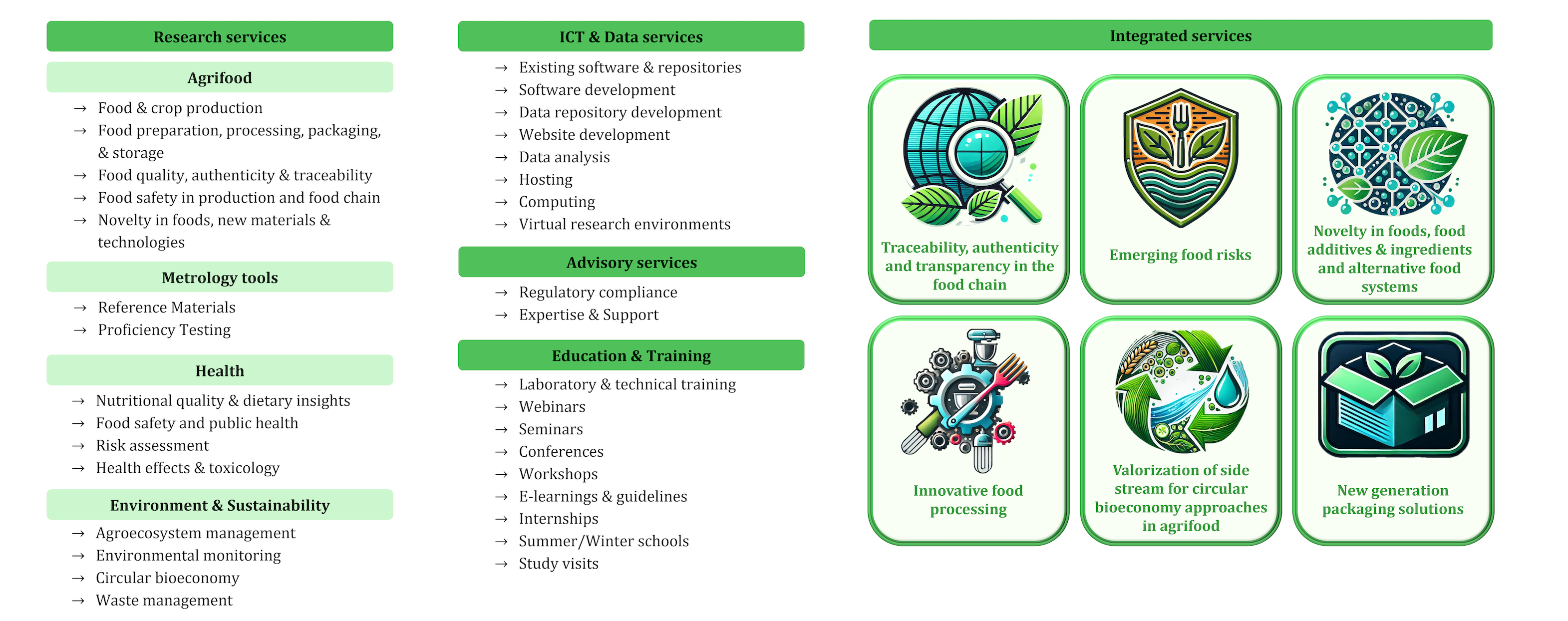 METROFOOD-RI is a distributed Research Infrastructure (RI) aimed at promoting scientific excellence in the field of food quality and safety. It provides high-quality metrology services in food and nutrition, comprising an important cross-section of highly interdisciplinary and interconnected fields throughout the food value chain, including agrifood, sustainable development, food safety, quality, traceability and authenticity, environmental safety, and human health. It combines a Physical-RI and an electronic-RI for open data deposition, access, and processing.