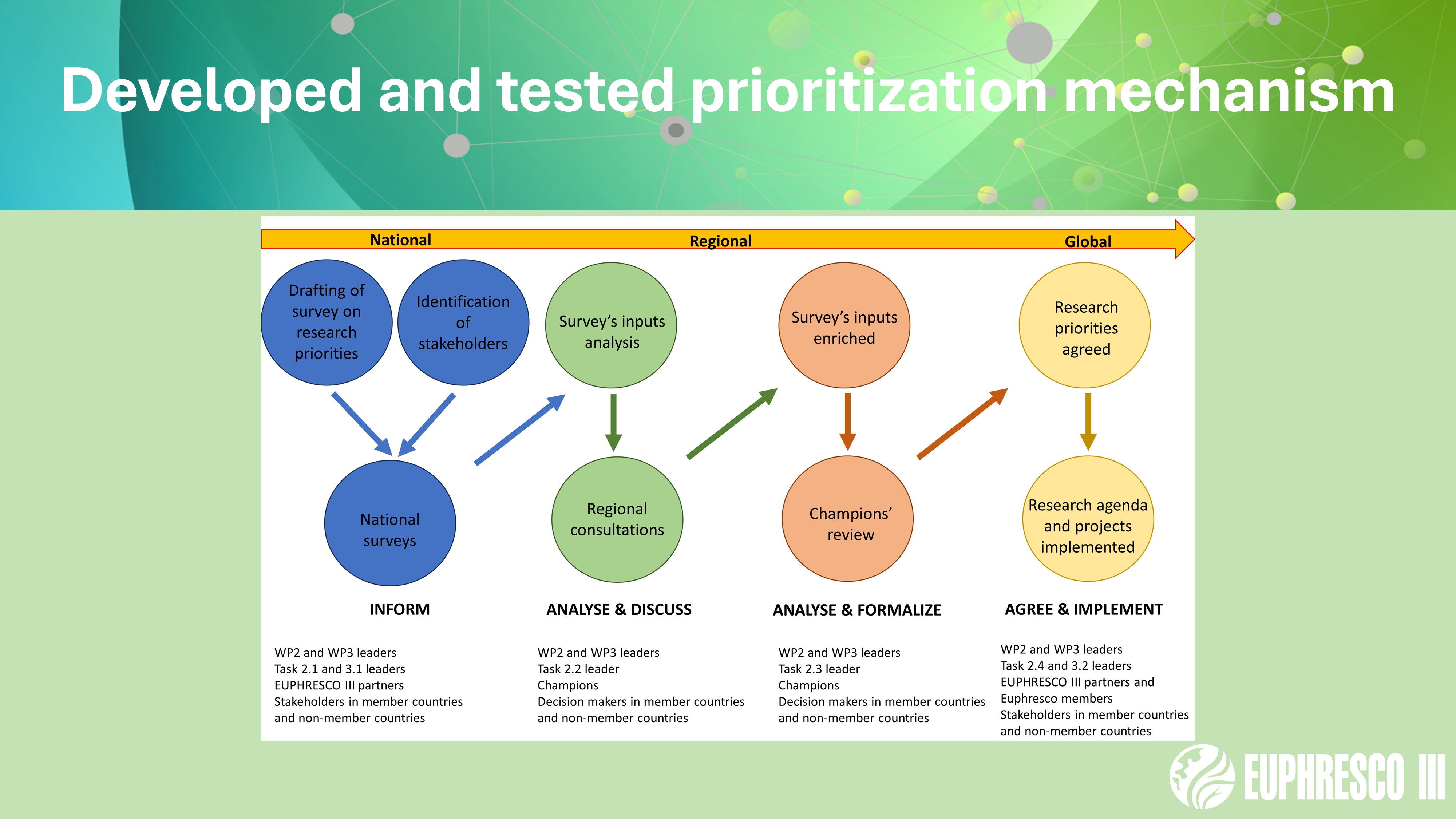 Prior to EUPHRESCO III, three models for global research coordination had been identified: i) a global network for phytosanitary research coordination and funding where the structure of the Euphresco net coordination will remain the same and the increase of Euphresco members/countries will be unlimited; ii) regional networks on the model of the Euphresco will be developed; and iii) a global network with a regional prioritization system. The EUPHRESCO III project has been built to test and validate the model of a global network with a regional prioritization system. A draft governance structure for such a global network has been developed and will be refined by December 2025. The Modus Operandi which will detail how the governance operates and the responsibilities of the network bodies will be developed during the second project period.