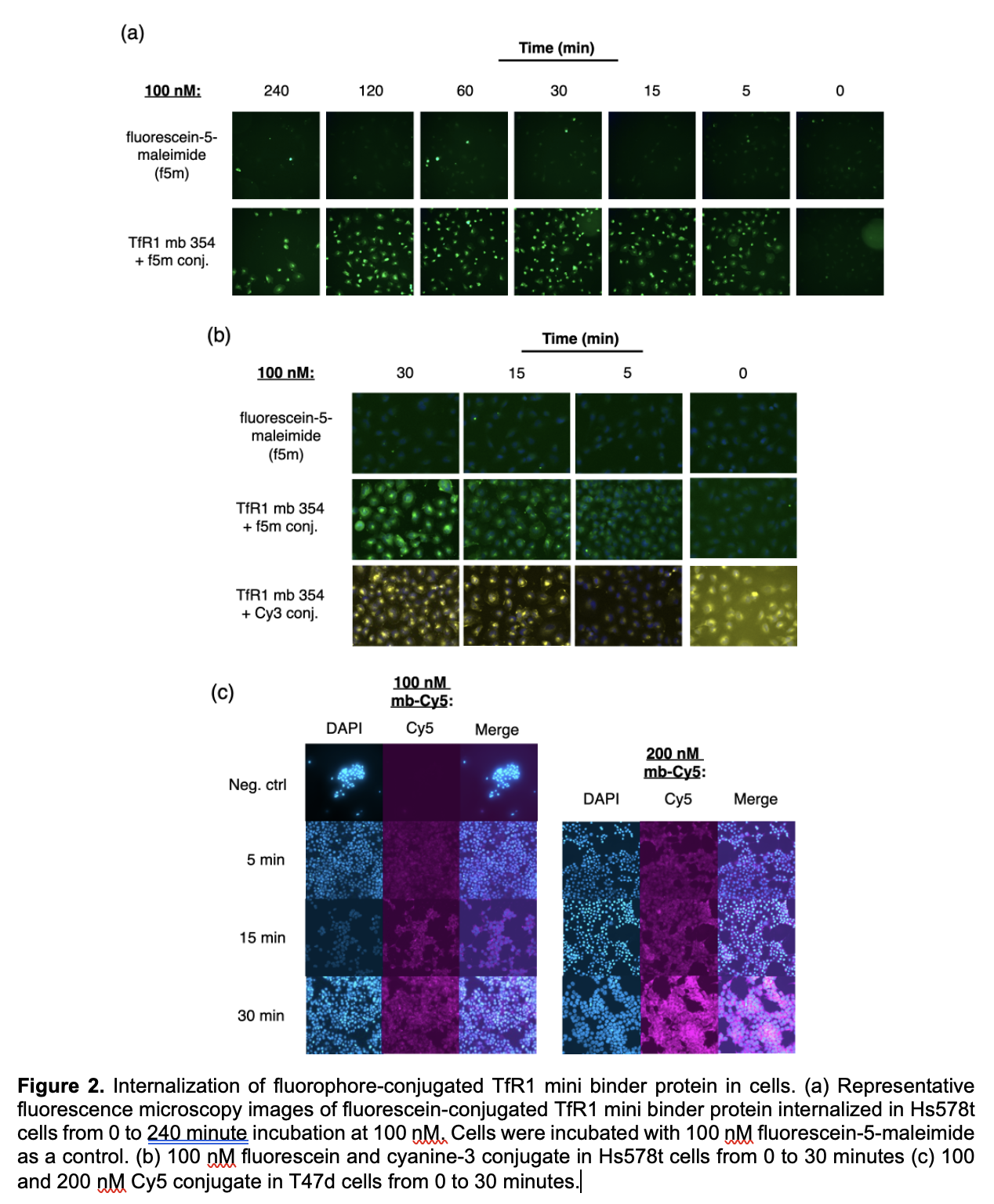 Outcome: TfR1 mini binder conjugated to fluorescein, Cyanine3, or Cyanine5 were successfully internalized in Hs578t and T47d cells.