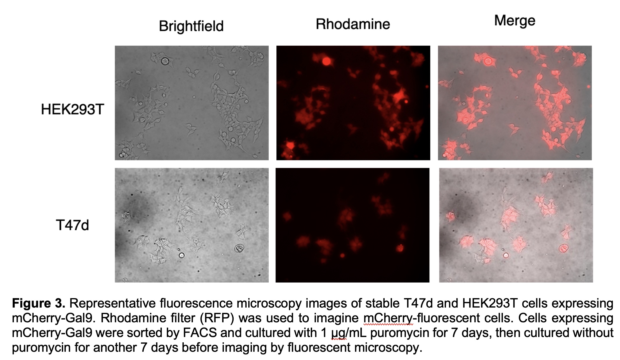 Outcome: T-47d and control HEK293T cells were successfully transfected and selected for stable generation of mCherry-Gal9+.