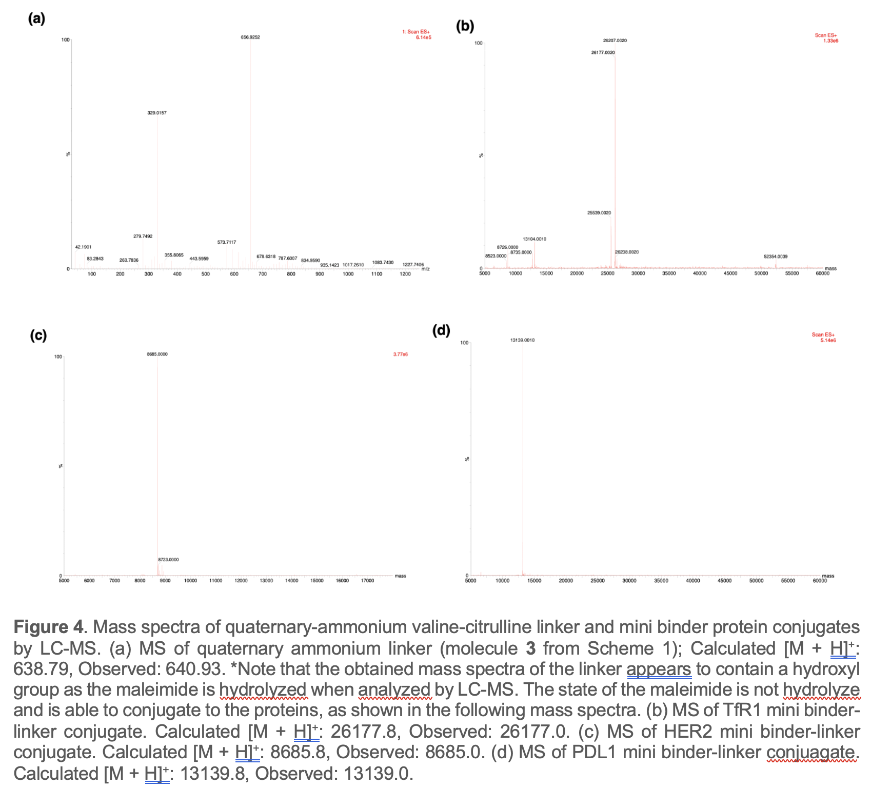 To summarize, we successfully confirmed rapid internalization of fluorophore-conjugated TfR1 mini binder protein in breast cancer Hs578t and T47d cells (Figure 2a-c). T47d and HEK293T stably expressing mCherry-Gal9 were generated (Figure 3). Finally, the quaternary ammonium-modified conjugate consisting of mini binder protein TfR1, HER2, or PDL1, valine-citrulline linker, and myristic acid at 80% or 100% efficiency, as determined by mass spectrometry (Figure 4).