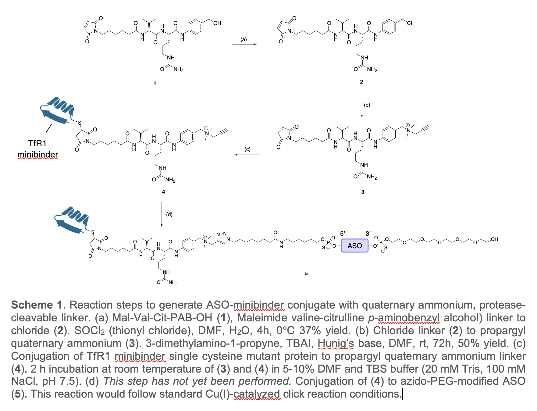 The synthetic scheme to make the modified protease-cleavable linker and subsequent conjugation to TfR1 mini binder protein and to ASO are outlined in Scheme 1. In brief, a protease-cleavable valine-citrulline para-aminobenzyl alcohol (1) is concerted into a chloride (2) by addition of thionyl chloride (SOCl2). Next, the chloride is converted into a propargyl quaternary ammonium moiety (3) by treatment with 3-dimethylamino-1-propyne, tetrabutyl ammonium iodide (TBAI), and Hunig's base. The linker is then conjugated to the TfR1 mini binder (4) by a simple conjugation reaction in 10% DMF and Tris-buffer for approximately 2 hours. Finally, the protein-linker conjugate is furthermore conjugated to azido-modified MEN1 ASO via copper(I)-catalyzed click chemistry reaction (5).